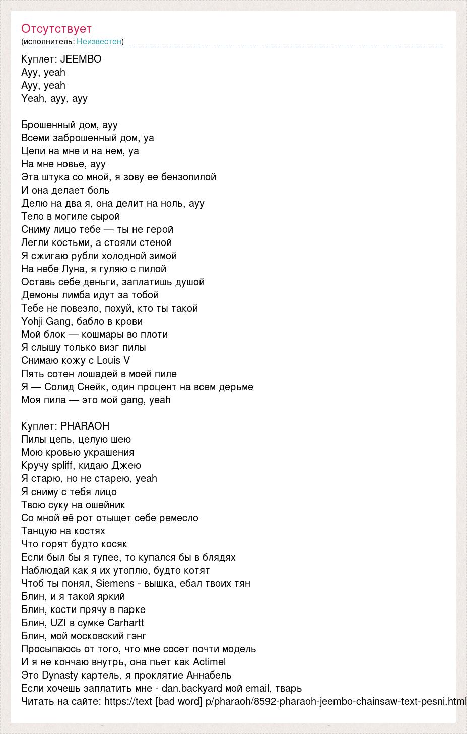 Куплет: JEEMBO Ayy, yeah Ayy, yeah Yeah, ayy, ayy Брошенный дом, ayy Всеми заброшенный дом, ya Цепи на мне и на нем, ya На мне новье, ayy Эта штука со мной, я зову ее бензопилой И она делает боль Делю на два я, она делит на ноль, ayy Тело в могиле сырой Сниму лицо тебе — ты не герой Легли костьми, а стояли стеной Я сжигаю рубли холодной зимой На небе Луна, я гуляю с пилой Оставь себе деньги, заплатишь душой Демоны лимба идут за тобой Тебе не повезло, похуй, кто ты такой Yohji Gang, бабло в крови Мой блок — кошмары во плоти Я слышу только визг пилы Снимаю кожу с Louis V Пять сотен лошадей в моей пиле Я — Солид Снейк, один процент на всем дерьме Моя пила — это мой gang, yeah Куплет: PHARAOH Пилы цепь, целую шею Мою кровью украшения Кручу spliff, кидаю Джею Я старю, но не старею, yeah Я сниму с тебя лицо Твою суку на ошейник Со мной её рот отыщет себе ремесло Танцую на костях Что горят будто косяк Если был бы я тупее, то купался бы в блядях Наблюдай как я их утоплю, будто котят Чтоб ты понял, Siemens - вышка, ебал твоих тян Блин, и я такой яркий Блин, кости прячу в парке Блин, UZI в сумке Carhartt Блин, мой московский гэнг Просыпаюсь от того, что мне сосет почти модель И я не кончаю внутрь, она пьет как Actimel Это Dynasty картель, я проклятие Аннабель Если хочешь заплатить мне - dan.backyard мой email, тварь Читать на сайте: https://text [bad word] p/pharaoh/8592-pharaoh-jeembo-chainsaw-text-pesni.html
