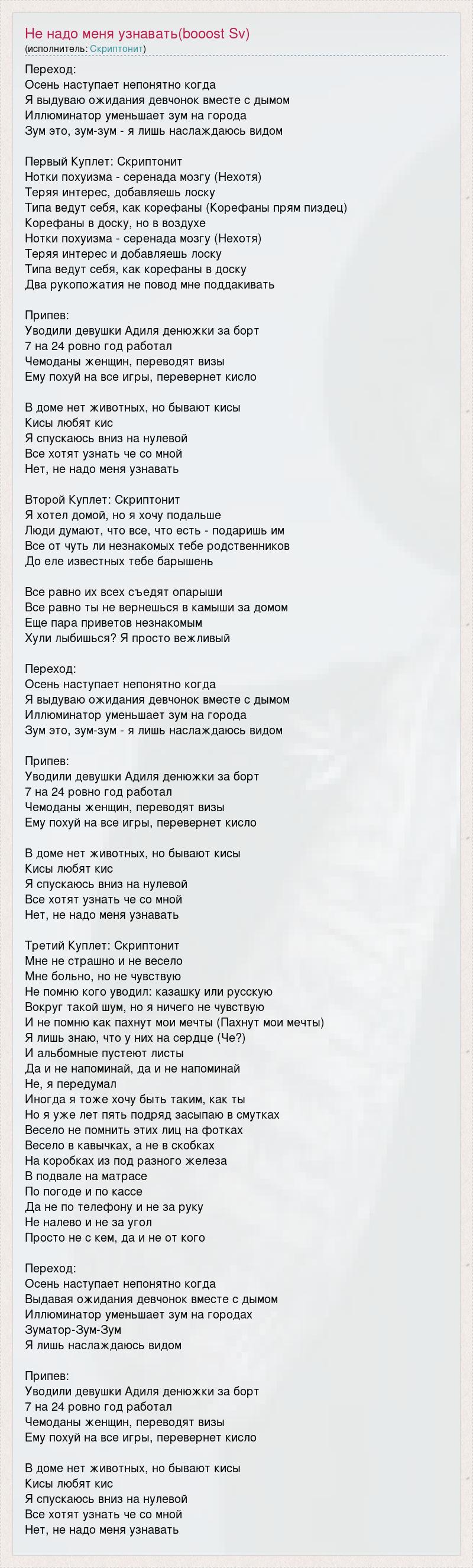 Переход: Осень наступает непонятно когда Я выдуваю ожидания девчонок вместе с дымом Иллюминатор уменьшает зум на города Зум это, зум-зум - я лишь наслаждаюсь видом Первый Куплет: Скриптонит Нотки похуизма - серенада мозгу (Нехотя) Теряя интерес, добавляешь лоску Типа ведут себя, как корефаны (Корефаны прям пиздец) Корефаны в доску, но в воздухе Нотки похуизма - серенада мозгу (Нехотя) Теряя интерес и добавляешь лоску Типа ведут себя, как корефаны в доску Два рукопожатия не повод мне поддакивать Припев: Уводили девушки Адиля денюжки за борт 7 на 24 ровно год работал Чемоданы женщин, переводят визы Ему похуй на все игры, перевернет кисло В доме нет животных, но бывают кисы Кисы любят кис Я спускаюсь вниз на нулевой Все хотят узнать че со мной Нет, не надо меня узнавать Второй Куплет: Скриптонит Я хотел домой, но я хочу подальше Люди думают, что все, что есть - подаришь им Все от чуть ли незнакомых тебе родственников До еле известных тебе барышень Все равно их всех съедят опарыши Все равно ты не вернешься в камыши за домом Еще пара приветов незнакомым Хули лыбишься? Я просто вежливый Переход: Осень наступает непонятно когда Я выдуваю ожидания девчонок вместе с дымом Иллюминатор уменьшает зум на города Зум это, зум-зум - я лишь наслаждаюсь видом Припев: Уводили девушки Адиля денюжки за борт 7 на 24 ровно год работал Чемоданы женщин, переводят визы Ему похуй на все игры, перевернет кисло В доме нет животных, но бывают кисы Кисы любят кис Я спускаюсь вниз на нулевой Все хотят узнать че со мной Нет, не надо меня узнавать Третий Куплет: Скриптонит Мне не страшно и не весело Мне больно, но не чувствую Не помню кого уводил: казашку или русскую Вокруг такой шум, но я ничего не чувствую И не помню как пахнут мои мечты (Пахнут мои мечты) Я лишь знаю, что у них на сердце (Че?) И альбомные пустеют листы Да и не напоминай, да и не напоминай Не, я передумал Иногда я тоже хочу быть таким, как ты Но я уже лет пять подряд засыпаю в смутках Весело не помнить этих лиц на фотках Весело в кавычках, а не в скобках На коробках из под разного железа В подвале на матрасе По погоде и по кассе Да не по телефону и не за руку Не налево и не за угол Просто не с кем, да и не от кого Переход: Осень наступает непонятно когда Выдавая ожидания девчонок вместе с дымом Иллюминатор уменьшает зум на городах Зуматор-Зум-Зум Я лишь наслаждаюсь видом Припев: Уводили девушки Адиля денюжки за борт 7 на 24 ровно год работал Чемоданы женщин, переводят визы Ему похуй на все игры, перевернет кисло В доме нет животных, но бывают кисы Кисы любят кис Я спускаюсь вниз на нулевой Все хотят узнать че со мной Нет, не надо меня узнавать