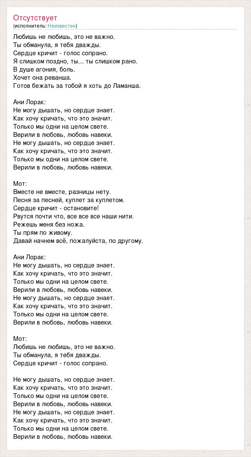 Любишь не любишь, это не важно. Ты обманула, я тебя дважды. Сердце кричит - голос сопрано. Я слишком поздно, ты... ты слишком рано. В душе агония, боль. Хочет она реванша. Готов бежать за тобой я хоть до Ламанша. Ани Лорак: Не могу дышать, но сердце знает. Как хочу кричать, что это значит. Только мы одни на целом свете. Верили в любовь, любовь навеки. Не могу дышать, но сердце знает. Как хочу кричать, что это значит. Только мы одни на целом свете. Верили в любовь, любовь навеки. Мот: Вместе не вместе, разницы нету. Песня за песней, куплет за куплетом. Сердце кричит - остановите! Рвутся почти что, все все все наши нити. Режешь меня без ножа. Ты прям по живому. Давай начнем всё, пожалуйста, по другому. Ани Лорак: Не могу дышать, но сердце знает. Как хочу кричать, что это значит. Только мы одни на целом свете. Верили в любовь, любовь навеки. Не могу дышать, но сердце знает. Как хочу кричать, что это значит. Только мы одни на целом свете. Верили в любовь, любовь навеки. Мот: Любишь не любишь, это не важно. Ты обманула, я тебя дважды. Сердце кричит - голос сопрано. Не могу дышать, но сердце знает. Как хочу кричать, что это значит. Только мы одни на целом свете. Верили в любовь, любовь навеки. Не могу дышать, но сердце знает. Как хочу кричать, что это значит. Только мы одни на целом свете. Верили в любовь, любовь навеки.