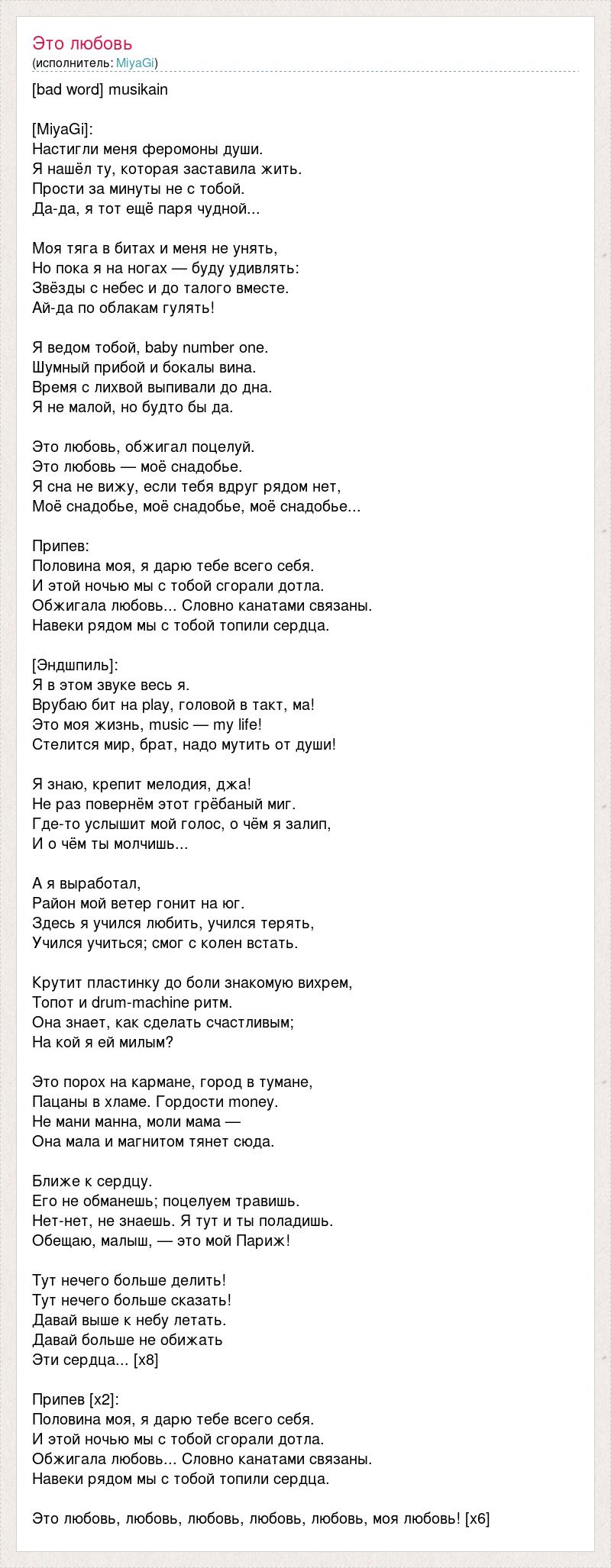 [bad word] musikain [MiyaGi]: Настигли меня феромоны души. Я нашёл ту, которая заставила жить. Прости за минуты не с тобой. Да-да, я тот ещё паря чудной... Моя тяга в битах и меня не унять, Но пока я на ногах — буду удивлять: Звёзды с небес и до талого вместе. Ай-да по облакам гулять! Я ведом тобой, baby number one. Шумный прибой и бокалы вина. Время с лихвой выпивали до дна. Я не малой, но будто бы да. Это любовь, обжигал поцелуй. Это любовь — моё снадобье. Я сна не вижу, если тебя вдруг рядом нет, Моё снадобье, моё снадобье, моё снадобье... Припев: Половина моя, я дарю тебе всего себя. И этой ночью мы с тобой сгорали дотла. Обжигала любовь... Словно канатами связаны. Навеки рядом мы с тобой топили сердца. [Эндшпиль]: Я в этом звуке весь я. Врубаю бит на play, головой в такт, ма! Это моя жизнь, music — my life! Стелится мир, брат, надо мутить от души! Я знаю, крепит мелодия, джа! Не раз повернём этот грёбаный миг. Где-то услышит мой голос, о чём я залип, И о чём ты молчишь... А я выработал, Район мой ветер гонит на юг. Здесь я учился любить, учился терять, Учился учиться; смог с колен встать. Крутит пластинку до боли знакомую вихрем, Топот и drum-machine ритм. Она знает, как сделать счастливым; На кой я ей милым? Это порох на кармане, город в тумане, Пацаны в хламе. Гордости money. Не мани манна, моли мама — Она мала и магнитом тянет сюда. Ближе к сердцу. Его не обманешь; поцелуем травишь. Нет-нет, не знаешь. Я тут и ты поладишь. Обещаю, малыш, — это мой Париж! Тут нечего больше делить! Тут нечего больше сказать! Давай выше к небу летать. Давай больше не обижать Эти сердца... [x8] Припев [x2]: Половина моя, я дарю тебе всего себя. И этой ночью мы с тобой сгорали дотла. Обжигала любовь... Словно канатами связаны. Навеки рядом мы с тобой топили сердца. Это любовь, любовь, любовь, любовь, любовь, моя любовь! [x6]