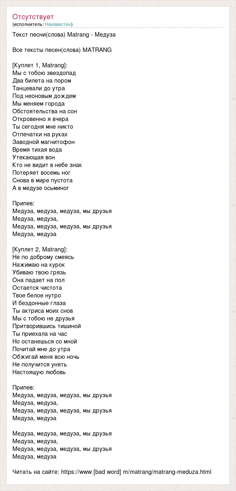 Текст песни(слова) Matrang - Медуза Все тексты песен(слова) MATRANG [Куплет 1, Matrang]: Мы с тобою звездопад Два билета на пором Танцевали до утра Под неоновым дождем Мы меняем города Обстоятельства на сон Откровенно я вчера Ты сегодня мне никто Отпечатки на руках Заводной магнитофон Время тихая вода Утекающая вон Кто не видит в небе знак Потеряет восемь ног Снова в мире пустота А в медузе осьминог Припев: Медуза, медуза, медуза, мы друзья Медуза, медуза, Медуза, медуза, медуза, мы друзья Медуза, медуза [Куплет 2, Matrang]: Не по доброму смеясь Нажимаю на курок Убиваю твою грязь Она падает на пол Остается чистота Твое белое нутро И бездонные глаза Ты актриса моих снов Мы с тобою не друзья Притворившись тишиной Ты приехала на час Но останешься со мной Почитай мне до утра Обжигай меня всю ночь Не получится унять Настоящую любовь Припев: Медуза, медуза, медуза, мы друзья Медуза, медуза, Медуза, медуза, медуза, мы друзья Медуза, медуза Медуза, медуза, медуза, мы друзья Медуза, медуза, Медуза, медуза, медуза, мы друзья Медуза, медуза Читать на сайте: https://www [bad word] m/matrang/matrang-meduza.html