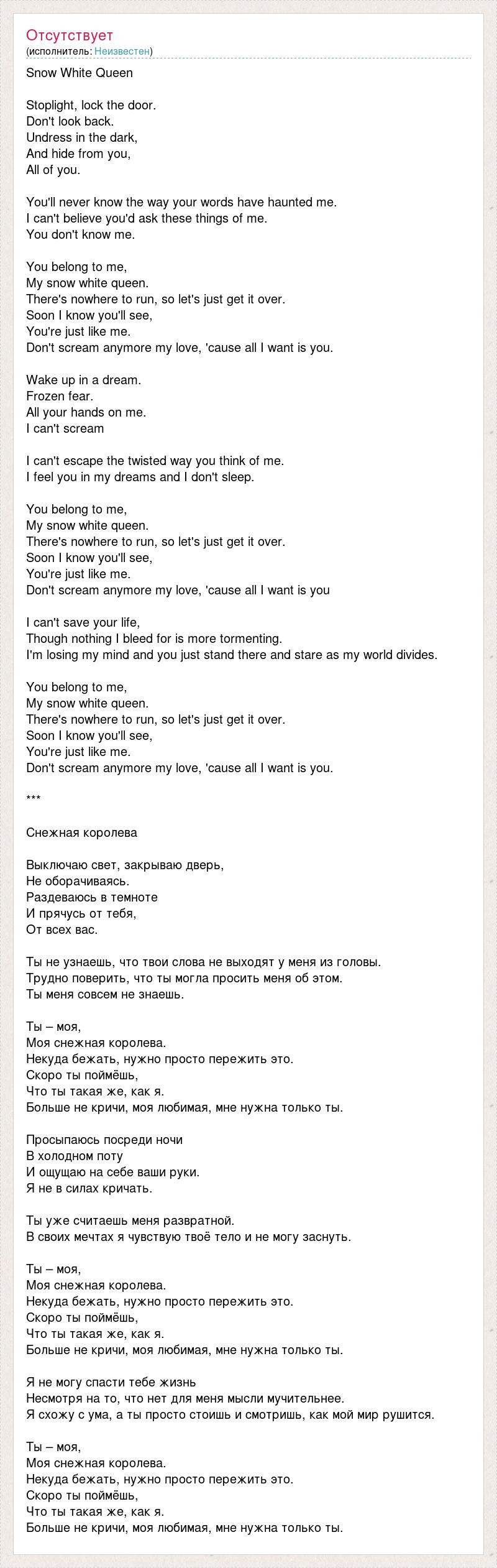 Snow White Queen Stoplight, lock the door. Don't look back. Undress in the dark, And hide from you, All of you. You'll never know the way your words have haunted me. I can't believe you'd ask these things of me. You don't know me. You belong to me, My snow white queen. There's nowhere to run, so let's just get it over. Soon I know you'll see, You're just like me. Don't scream anymore my love, 'cause all I want is you. Wake up in a dream. Frozen fear. All your hands on me. I can't scream I can't escape the twisted way you think of me. I feel you in my dreams and I don't sleep. You belong to me, My snow white queen. There's nowhere to run, so let's just get it over. Soon I know you'll see, You're just like me. Don't scream anymore my love, 'cause all I want is you I can't save your life, Though nothing I bleed for is more tormenting. I'm losing my mind and you just stand there and stare as my world divides. You belong to me, My snow white queen. There's nowhere to run, so let's just get it over. Soon I know you'll see, You're just like me. Don't scream anymore my love, 'cause all I want is you. *** Снежная королева Выключаю свет, закрываю дверь, Не оборачиваясь. Раздеваюсь в темноте И прячусь от тебя, От всех вас. Ты не узнаешь, что твои слова не выходят у меня из головы. Трудно поверить, что ты могла просить меня об этом. Ты меня совсем не знаешь. Ты – моя, Моя снежная королева. Некуда бежать, нужно просто пережить это. Скоро ты поймёшь, Что ты такая же, как я. Больше не кричи, моя любимая, мне нужна только ты. Просыпаюсь посреди ночи В холодном поту И ощущаю на себе ваши руки. Я не в силах кричать. Ты уже считаешь меня развратной. В своих мечтах я чувствую твоё тело и не могу заснуть. Ты – моя, Моя снежная королева. Некуда бежать, нужно просто пережить это. Скоро ты поймёшь, Что ты такая же, как я. Больше не кричи, моя любимая, мне нужна только ты. Я не могу спасти тебе жизнь Несмотря на то, что нет для меня мысли мучительнее. Я схожу с ума, а ты просто стоишь и смотришь, как мой мир рушится. Ты – моя, Моя снежная королева. Некуда бежать, нужно просто пережить это. Скоро ты поймёшь, Что ты такая же, как я. Больше не кричи, моя любимая, мне нужна только ты.