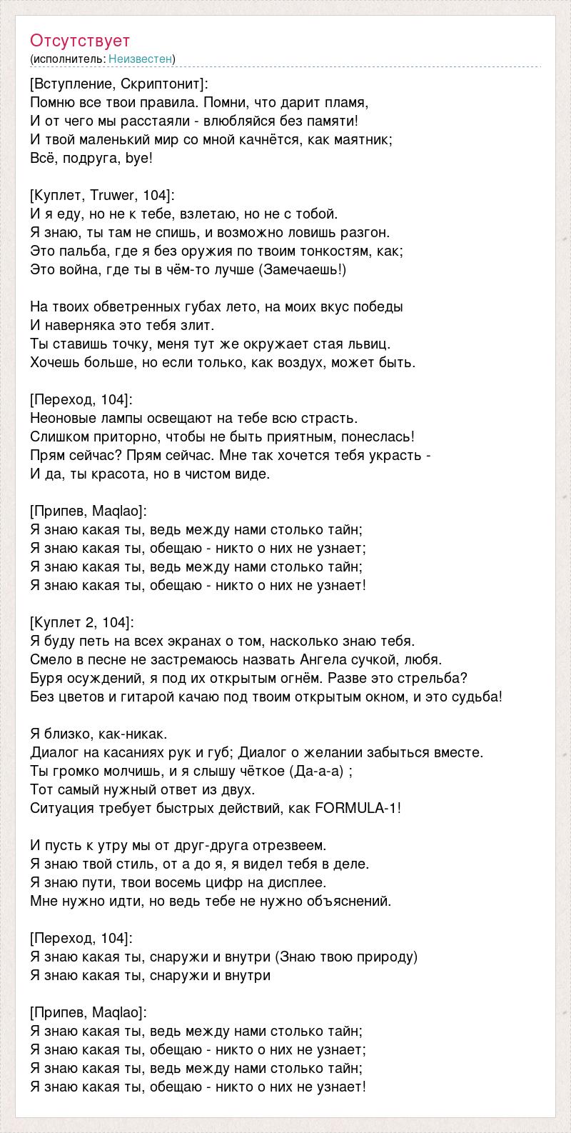 [Вступление, Скриптонит]: Помню все твои правила. Помни, что дарит пламя, И от чего мы расстаяли - влюбляйся без памяти! И твой маленький мир со мной качнётся, как маятник; Всё, подруга, bye! [Куплет, Truwer, 104]: И я еду, но не к тебе, взлетаю, но не с тобой. Я знаю, ты там не спишь, и возможно ловишь разгон. Это пальба, где я без оружия по твоим тонкостям, как; Это война, где ты в чём-то лучше (Замечаешь!) На твоих обветренных губах лето, на моих вкус победы И наверняка это тебя злит. Ты ставишь точку, меня тут же окружает стая львиц. Хочешь больше, но если только, как воздух, может быть. [Переход, 104]: Неоновые лампы освещают на тебе всю страсть. Слишком приторно, чтобы не быть приятным, понеслась! Прям сейчас? Прям сейчас. Мне так хочется тебя украсть - И да, ты красота, но в чистом виде. [Припев, Maqlao]: Я знаю какая ты, ведь между нами столько тайн; Я знаю какая ты, обещаю - никто о них не узнает; Я знаю какая ты, ведь между нами столько тайн; Я знаю какая ты, обещаю - никто о них не узнает! [Куплет 2, 104]: Я буду петь на всех экранах о том, насколько знаю тебя. Смело в песне не застремаюсь назвать Ангела сучкой, любя. Буря осуждений, я под их открытым огнём. Разве это стрельба? Без цветов и гитарой качаю под твоим открытым окном, и это судьба! Я близко, как-никак. Диалог на касаниях рук и губ; Диалог о желании забыться вместе. Ты громко молчишь, и я слышу чёткое (Да-а-а) ; Тот самый нужный ответ из двух. Ситуация требует быстрых действий, как FORMULA-1! И пусть к утру мы от друг-друга отрезвеем. Я знаю твой стиль, от а до я, я видел тебя в деле. Я знаю пути, твои восемь цифр на дисплее. Мне нужно идти, но ведь тебе не нужно объяснений. [Переход, 104]: Я знаю какая ты, снаружи и внутри (Знаю твою природу) Я знаю какая ты, снаружи и внутри [Припев, Maqlao]: Я знаю какая ты, ведь между нами столько тайн; Я знаю какая ты, обещаю - никто о них не узнает; Я знаю какая ты, ведь между нами столько тайн; Я знаю какая ты, обещаю - никто о них не узнает!