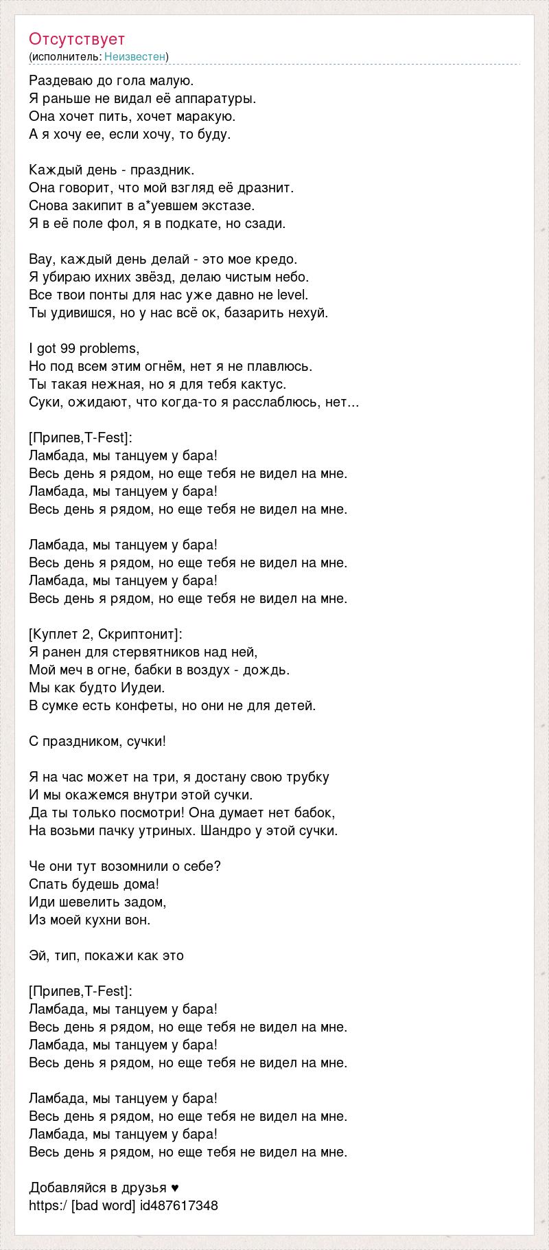 Раздеваю до гола малую. Я раньше не видал её аппаратуры. Она хочет пить, хочет маракую. А я хочу ее, если хочу, то буду. Каждый день - праздник. Она говорит, что мой взгляд её дразнит. Снова закипит в а*уевшем экстазе. Я в её поле фол, я в подкате, но сзади. Вау, каждый день делай - это мое кредо. Я убираю ихних звёзд, делаю чистым небо. Все твои понты для нас уже давно не level. Ты удивишся, но у нас всё ок, базарить нехуй. I got 99 problems, Но под всем этим огнём, нет я не плавлюсь. Ты такая нежная, но я для тебя кактус. Суки, ожидают, что когда-то я расслаблюсь, нет... [Припев,T-Fest]: Ламбада, мы танцуем у бара! Весь день я рядом, но еще тебя не видел на мне. Ламбада, мы танцуем у бара! Весь день я рядом, но еще тебя не видел на мне. Ламбада, мы танцуем у бара! Весь день я рядом, но еще тебя не видел на мне. Ламбада, мы танцуем у бара! Весь день я рядом, но еще тебя не видел на мне. [Куплет 2, Скриптонит]: Я ранен для стервятников над ней, Мой меч в огне, бабки в воздух - дождь. Мы как будто Иудеи. В сумке есть конфеты, но они не для детей. С праздником, сучки! Я на час может на три, я достану свою трубку И мы окажемся внутри этой сучки. Да ты только посмотри! Она думает нет бабок, На возьми пачку утриных. Шандро у этой сучки. Че они тут возомнили о себе? Спать будешь дома! Иди шевелить задом, Из моей кухни вон. Эй, тип, покажи как это [Припев,T-Fest]: Ламбада, мы танцуем у бара! Весь день я рядом, но еще тебя не видел на мне. Ламбада, мы танцуем у бара! Весь день я рядом, но еще тебя не видел на мне. Ламбада, мы танцуем у бара! Весь день я рядом, но еще тебя не видел на мне. Ламбада, мы танцуем у бара! Весь день я рядом, но еще тебя не видел на мне. Добавляйся в друзья ♥ https:/ [bad word] id487617348