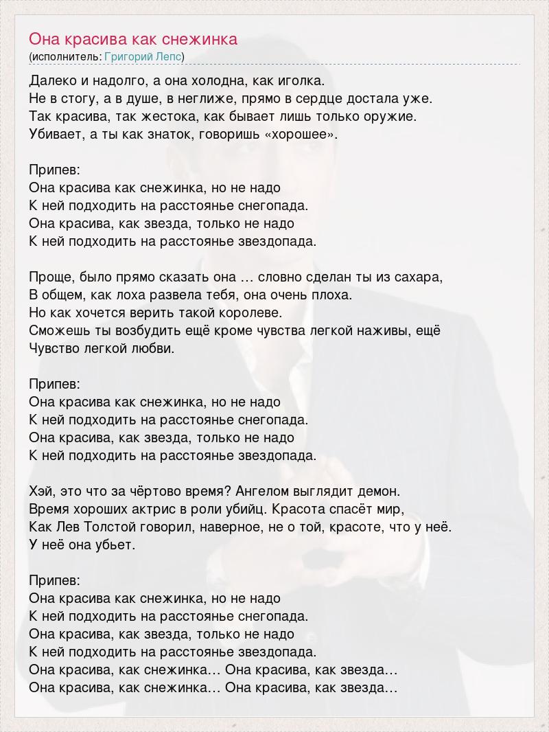 Далеко и надолго, а она холодна, как иголка. Не в стогу, а в душе, в неглиже, прямо в сердце достала уже. Так красива, так жестока, как бывает лишь только оружие. Убивает, а ты как знаток, говоришь «хорошее». Припев: Она красива как снежинка, но не надо К ней подходить на расстоянье снегопада. Она красива, как звезда, только не надо К ней подходить на расстоянье звездопада. Проще, было прямо сказать она … словно сделан ты из сахара, В общем, как лоха развела тебя, она очень плоха. Но как хочется верить такой королеве. Сможешь ты возбудить ещё кроме чувства легкой наживы, ещё Чувство легкой любви. Припев: Она красива как снежинка, но не надо К ней подходить на расстоянье снегопада. Она красива, как звезда, только не надо К ней подходить на расстоянье звездопада. Хэй, это что за чёртово время? Ангелом выглядит демон. Время хороших актрис в роли убийц. Красота спасёт мир, Как Лев Толстой говорил, наверное, не о той, красоте, что у неё. У неё она убьет. Припев: Она красива как снежинка, но не надо К ней подходить на расстоянье снегопада. Она красива, как звезда, только не надо К ней подходить на расстоянье звездопада. Она красива, как снежинка… Она красива, как звезда… Она красива, как снежинка… Она красива, как звезда…