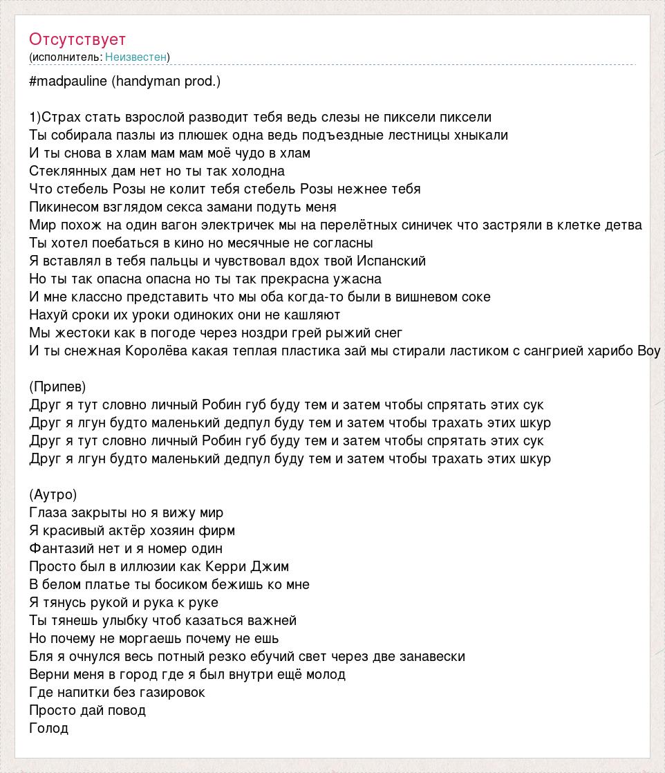 #madpauline (handyman prod.) 1)Страх стать взрослой разводит тебя ведь слезы не пиксели пиксели Ты собирала пазлы из плюшек одна ведь подъездные лестницы хныкали И ты снова в хлам мам мам моё чудо в хлам Стеклянных дам нет но ты так холодна Что стебель Розы не колит тебя стебель Розы нежнее тебя Пикинесом взглядом секса замани подуть меня Мир похож на один вагон электричек мы на перелётных синичек что застряли в клетке детва Ты хотел поебаться в кино но месячные не согласны Я вставлял в тебя пальцы и чувствовал вдох твой Испанский Но ты так опасна опасна но ты так прекрасна ужасна И мне классно представить что мы оба когда-то были в вишневом соке Нахуй сроки их уроки одиноких они не кашляют Мы жестоки как в погоде через ноздри грей рыжий снег И ты снежная Королёва какая теплая пластика зай мы стирали ластиком с сангрией харибо Воу (Припев) Друг я тут словно личный Робин губ буду тем и затем чтобы спрятать этих сук Друг я лгун будто маленький дедпул буду тем и затем чтобы трахать этих шкур Друг я тут словно личный Робин губ буду тем и затем чтобы спрятать этих сук Друг я лгун будто маленький дедпул буду тем и затем чтобы трахать этих шкур (Аутро) Глаза закрыты но я вижу мир Я красивый актёр хозяин фирм Фантазий нет и я номер один Просто был в иллюзии как Керри Джим В белом платье ты босиком бежишь ко мне Я тянусь рукой и рука к руке Ты тянешь улыбку чтоб казаться важней Но почему не моргаешь почему не ешь Бля я очнулся весь потный резко ебучий свет через две занавески Верни меня в город где я был внутри ещё молод Где напитки без газировок Просто дай повод Голод