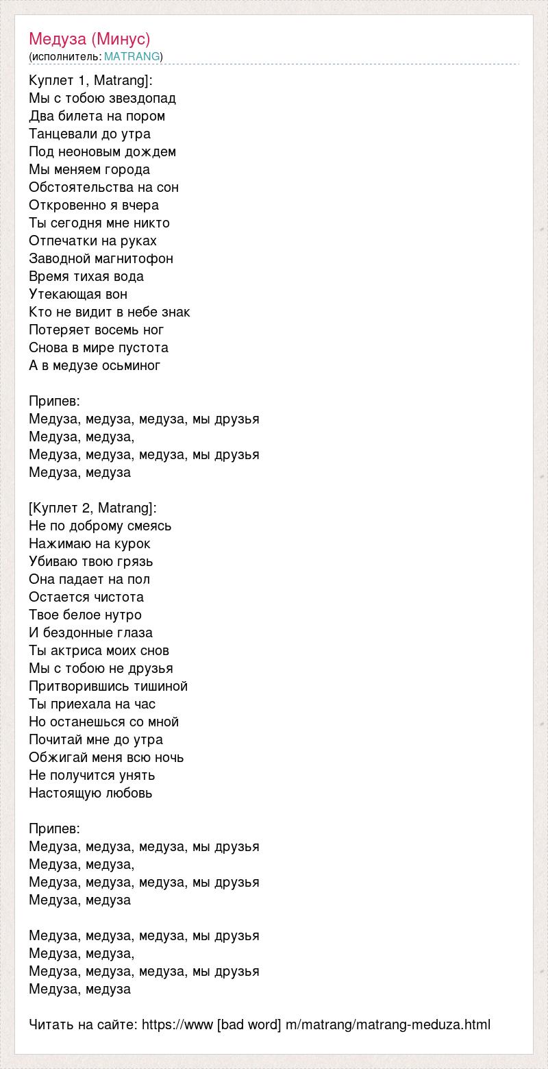 Куплет 1, Matrang]: Мы с тобою звездопад Два билета на пором Танцевали до утра Под неоновым дождем Мы меняем города Обстоятельства на сон Откровенно я вчера Ты сегодня мне никто Отпечатки на руках Заводной магнитофон Время тихая вода Утекающая вон Кто не видит в небе знак Потеряет восемь ног Снова в мире пустота А в медузе осьминог Припев: Медуза, медуза, медуза, мы друзья Медуза, медуза, Медуза, медуза, медуза, мы друзья Медуза, медуза [Куплет 2, Matrang]: Не по доброму смеясь Нажимаю на курок Убиваю твою грязь Она падает на пол Остается чистота Твое белое нутро И бездонные глаза Ты актриса моих снов Мы с тобою не друзья Притворившись тишиной Ты приехала на час Но останешься со мной Почитай мне до утра Обжигай меня всю ночь Не получится унять Настоящую любовь Припев: Медуза, медуза, медуза, мы друзья Медуза, медуза, Медуза, медуза, медуза, мы друзья Медуза, медуза Медуза, медуза, медуза, мы друзья Медуза, медуза, Медуза, медуза, медуза, мы друзья Медуза, медуза Читать на сайте: https://www [bad word] m/matrang/matrang-meduza.html