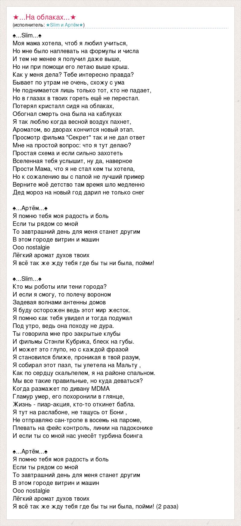 ♠...Slim...♠ Моя мама хотела, чтоб я любил учиться, Но мне было наплевать на формулы и числа И тем не менее я получил даже выше, Но ни при помощи его летаю выше крыш. Как у меня дела? Тебе интересно правда? Бывает по утрам не очень, схожу с ума Не поднимается лишь только тот, кто не падает, Но в глазах в твоих гореть ещё не перестал. Потерял кристалл сидя на облаках, Обогнал смерть она была на каблуках Я так люблю когда весной воздух пахнет, Ароматом, во дворах кончится новый этап. Просмотр фильма "Секрет" так и не дал ответ Мне на простой вопрос: что я тут делаю? Простая схема и если сильно захотеть Вселенная тебя услышит, ну да, наверное Прости Мама, что я не стал кем ты хотела, Но к сожалению вы с папой не лучший пример Верните моё детство там время шло медленно Дед мороз на новый год дарил не только снег ♠...Артём...♠ Я помню тебя моя радость и боль Если ты рядом со мной То завтрашний день для меня станет другим В этом городе витрин и машин Ооо nostalgie Лёгкий аромат духов твоих Я всё так же жду тебя где бы ты ни была, пойми! ♠...Slim...♠ Кто мы роботы или тени города? И если я смогу, то полечу вороном Задевая волнами антенны домов Я буду осторожен ведь этот мир жесток. Я помню как тебя увидел и тогда подумал Под утро, ведь она походу не дура. Ты говорила мне про закрытые клубы И фильмы Стэнли Кубрика, блеск на губы. И может это глупо, но с каждой фразой Я становился ближе, проникая в твой разум, Я собирал этот пазл, ты улетела на Мальту , Как по сердцу скальпелем, я на районе спальном. Мы все такие правильные, но куда деваться? Когда размажет по дивану MDMA Гламур умер, его похоронили в глянце, Жизнь - пиар-акция, кто-то откинет бабла. Я тут на раслабоне, не тащусь от Бони , Не отправляю сан-тропе в восемь на пароме, Плевать на фейс контроль, линии на падоконике И если ты со мной нас унесёт турбина боинга ♠...Артём...♠ Я помню тебя моя радость и боль Если ты рядом со мной То завтрашний день для меня станет другим В этом городе витрин и машин Ооо nostalgie Лёгкий аромат духов твоих Я всё так же жду тебя где бы ты ни была, пойми! (2 раза)