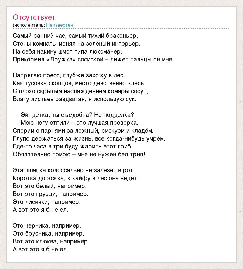 Самый ранний час, самый тихий браконьер, Стены комнаты меняя на зелёный интерьер. На себя накину шмот типа люксманер, Прикормил «Дружка» сосиской – лижет пальцы он мне. Напрягаю пресс, глубже захожу в лес. Как тусовка скопцов, место девственно здесь. С плохо скрытым наслаждением комары сосут, Влагу листьев раздвигая, я использую сук. — Эй, детка, ты съедобна? Не подделка? — Мою ногу отпили – это лучшая проверка. Спорим с парнями за ложный, рискуем и кладём. Глупо держаться за жизнь, все когда-нибудь умрём. Где-то часа в три буду жарить этот гриб. Обязательно помою – мне не нужен бэд трип! Эта шляпка колоссально не залезет в рот. Коротка дорожка, к кайфу в лес она ведёт. Вот это белый, например. Вот это грузди, например. Это лисички, например. А вот это я б не ел. Это черника, например. Это брусника, например. Вот это клюква, например. А вот это я б не ел.