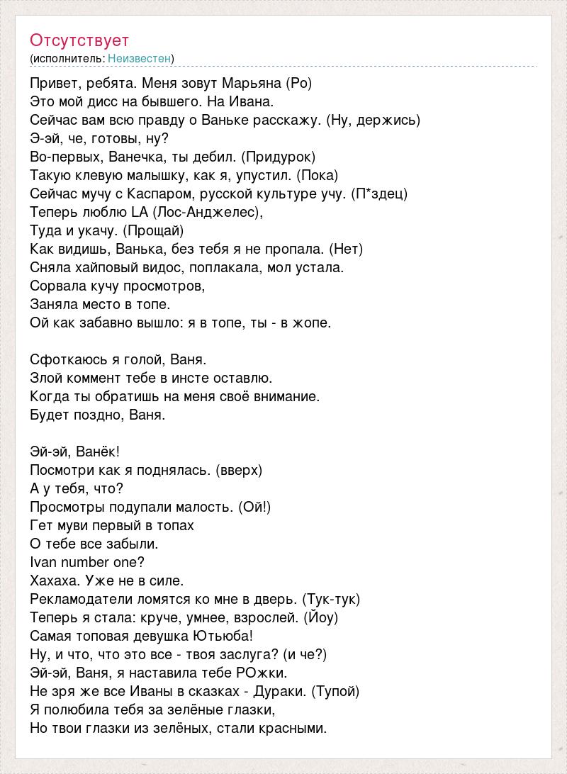 Привет, ребята. Меня зовут Марьяна (Ро) Это мой дисс на бывшего. На Ивана. Сейчас вам всю правду о Ваньке расскажу. (Ну, держись) Э-эй, че, готовы, ну? Во-первых, Ванечка, ты дебил. (Придурок) Такую клевую малышку, как я, упустил. (Пока) Сейчас мучу с Каспаром, русской культуре учу. (П*здец) Теперь люблю LA (Лос-Анджелес), Туда и укачу. (Прощай) Как видишь, Ванька, без тебя я не пропала. (Нет) Сняла хайповый видос, поплакала, мол устала. Сорвала кучу просмотров, Заняла место в топе. Ой как забавно вышло: я в топе, ты - в жопе. Сфоткаюсь я голой, Ваня. Злой коммент тебе в инсте оставлю. Когда ты обратишь на меня своё внимание. Будет поздно, Ваня. Эй-эй, Ванёк! Посмотри как я поднялась. (вверх) А у тебя, что? Просмотры подупали малость. (Ой!) Гет муви первый в топах О тебе все забыли. Ivan number one? Хахаха. Уже не в силе. Рекламодатели ломятся ко мне в дверь. (Тук-тук) Теперь я стала: круче, умнее, взрослей. (Йоу) Самая топовая девушка Ютьюба! Ну, и что, что это все - твоя заслуга? (и че?) Эй-эй, Ваня, я наставила тебе РОжки. Не зря же все Иваны в сказках - Дураки. (Тупой) Я полюбила тебя за зелёные глазки, Но твои глазки из зелёных, стали красными.