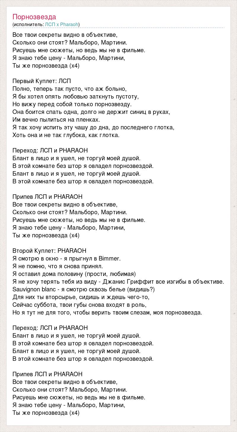 Все твои секреты видно в объективе, Сколько они стоят? Мальборо, Мартини. Рисуешь мне сюжеты, но ведь мы не в фильме. Я знаю тебе цену - Мальборо, Мартини, Ты же порнозвезда (х4) Первый Куплет: ЛСП Полно, теперь так пусто, что аж больно, Я бы хотел опять любовью заткнуть пустоту, Но вижу перед собой только порнозвезду. Она боится спать одна, долго не держит синиц в руках, Им вечно пылиться на пленках. Я так хочу испить эту чашу до дна, до последнего глотка, Хоть она и не так глубока, как глотка. Переход: ЛСП и PHARAOH Блант в лицо и я ушел, не торгуй моей душой. В этой комнате без штор я овладел порнозвездой. Блант в лицо и я ушел, не торгуй моей душой. В этой комнате без штор я овладел порнозвездой. Припев ЛСП и PHARAOH Все твои секреты видно в объективе, Сколько они стоят? Мальборо, Мартини. Рисуешь мне сюжеты, но ведь мы не в фильме. Я знаю тебе цену - Мальборо, Мартини, Ты же порнозвезда (х4) Второй Куплет: PHARAOH Я смотрю в окно - я прыгнул в Bimmer. Я не помню, что я снова принял. Я оставил дома половину (прости, любимая) Я не хочу терять тебя из виду - Джанис Гриффит все изгибы в объективе. Sauvignon blanc - я смотрю сквозь белье (видишь?) Для них ты вторсырье, сидишь и ждешь чего-то, Сейчас суббота, твои губы снова входят в роль, Но я тут не для того, чтобы верить твоим слезам, моя порнозвезда. Переход: ЛСП и PHARAOH Блант в лицо и я ушел, не торгуй моей душой. В этой комнате без штор я овладел порнозвездой. Блант в лицо и я ушел, не торгуй моей душой. В этой комнате без штор я овладел порнозвездой. Припев ЛСП и PHARAOH Все твои секреты видно в объективе, Сколько они стоят? Мальборо, Мартини. Рисуешь мне сюжеты, но ведь мы не в фильме. Я знаю тебе цену - Мальборо, Мартини, Ты же порнозвезда (х4)