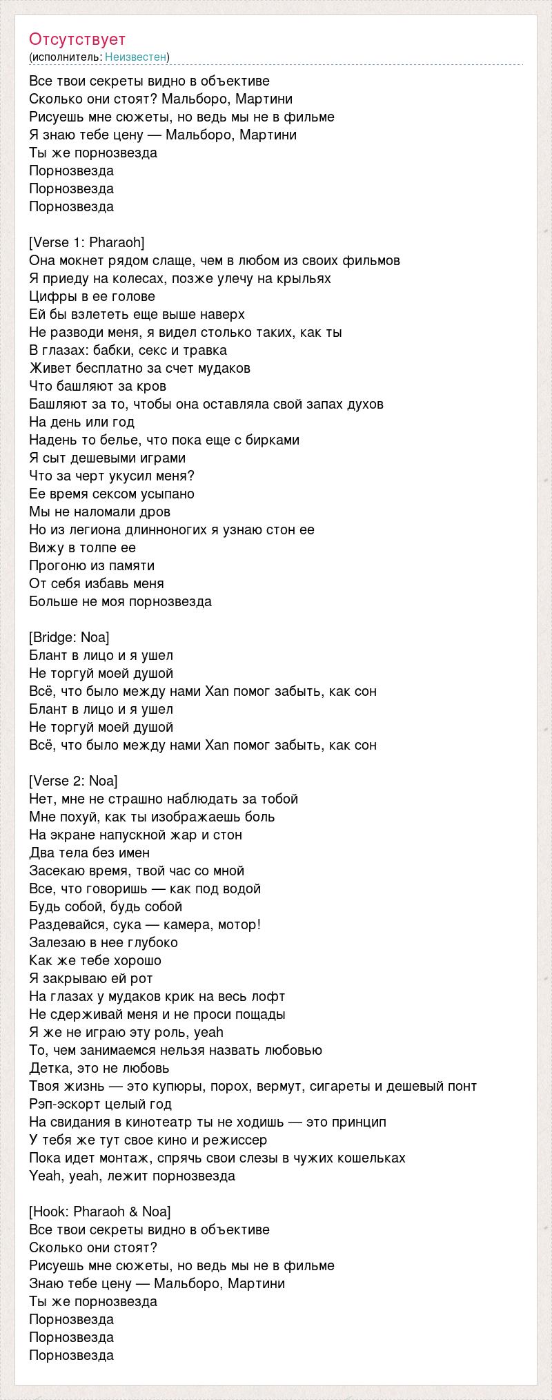 Все твои секреты видно в объективе Сколько они стоят? Мальборо, Мартини Рисуешь мне сюжеты, но ведь мы не в фильме Я знаю тебе цену — Мальборо, Мартини Ты же порнозвезда Порнозвезда Порнозвезда Порнозвезда [Verse 1: Pharaoh] Она мокнет рядом слаще, чем в любом из своих фильмов Я приеду на колесах, позже улечу на крыльях Цифры в ее голове Ей бы взлететь еще выше наверх Не разводи меня, я видел столько таких, как ты В глазах: бабки, секс и травка Живет бесплатно за счет мудаков Что башляют за кров Башляют за то, чтобы она оставляла свой запах духов На день или год Надень то белье, что пока еще с бирками Я сыт дешевыми играми Что за черт укусил меня? Ее время сексом усыпано Мы не наломали дров Но из легиона длинноногих я узнаю стон ее Вижу в толпе ее Прогоню из памяти От себя избавь меня Больше не моя порнозвезда [Bridge: Noa] Блант в лицо и я ушел Не торгуй моей душой Всё, что было между нами Xan помог забыть, как сон Блант в лицо и я ушел Не торгуй моей душой Всё, что было между нами Xan помог забыть, как сон [Verse 2: Noa] Нет, мне не страшно наблюдать за тобой Мне похуй, как ты изображаешь боль На экране напускной жар и стон Два тела без имен Засекаю время, твой час со мной Все, что говоришь — как под водой Будь собой, будь собой Раздевайся, сука — камера, мотор! Залезаю в нее глубоко Как же тебе хорошо Я закрываю ей рот На глазах у мудаков крик на весь лофт Не сдерживай меня и не проси пощады Я же не играю эту роль, yeah То, чем занимаемся нельзя назвать любовью Детка, это не любовь Твоя жизнь — это купюры, порох, вермут, сигареты и дешевый понт Рэп-эскорт целый год На свидания в кинотеатр ты не ходишь — это принцип У тебя же тут свое кино и режиссер Пока идет монтаж, спрячь свои слезы в чужих кошельках Yeah, yeah, лежит порнозвезда [Hook: Pharaoh & Noa] Все твои секреты видно в объективе Сколько они стоят? Рисуешь мне сюжеты, но ведь мы не в фильме Знаю тебе цену — Мальборо, Мартини Ты же порнозвезда Порнозвезда Порнозвезда Порнозвезда