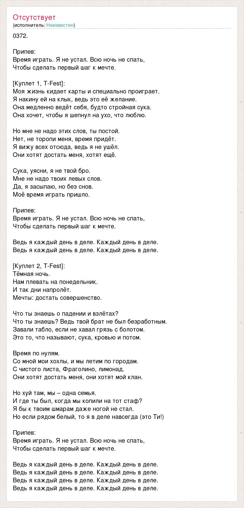 0372. Припев: Время играть. Я не устал. Всю ночь не спать, Чтобы сделать первый шаг к мечте. [Куплет 1, T-Fest]: Моя жизнь кидает карты и специально проиграет. Я накину ей на клык, ведь это её желание. Она медленно ведёт себя, будто стройная сука. Она хочет, чтобы я шепнул на ухо, что люблю. Но мне не надо этих слов, ты постой. Нет, не торопи меня, время придёт. Я вижу всех отсюда, ведь я не ушёл. Они хотят достать меня, хотят ещё. Сука, уясни, я не твой бро. Мне не надо твоих левых слов. Да, я засыпаю, но без снов. Моё время играть пришло. Припев: Время играть. Я не устал. Всю ночь не спать, Чтобы сделать первый шаг к мечте. Ведь я каждый день в деле. Каждый день в деле. Ведь я каждый день в деле. Каждый день в деле. [Куплет 2, T-Fest]: Тёмная ночь. Нам плевать на понедельник. И так дни напролёт. Мечты: достать совершенство. Что ты знаешь о падении и взлётах? Что ты знаешь? Ведь твой брат не был безработным. Завали табло, если не хавал грязь с болотом. Это то, что называют, сука, кровью и потом. Время по нулям. Со мной мои хохлы, и мы летим по городам. С чистого листа, Фраголино, лимонад. Они хотят достать меня, они хотят мой клан. Но хуй там, мы – одна семья. И где ты был, когда мы копили на тот стаф? Я бы к твоим шмарам даже ногой не стал. Но если рядом белый, то я в деле навсегда (это Ти!) Припев: Время играть. Я не устал. Всю ночь не спать, Чтобы сделать первый шаг к мечте. Ведь я каждый день в деле. Каждый день в деле. Ведь я каждый день в деле. Каждый день в деле. Ведь я каждый день в деле. Каждый день в деле. Ведь я каждый день в деле. Каждый день в деле.