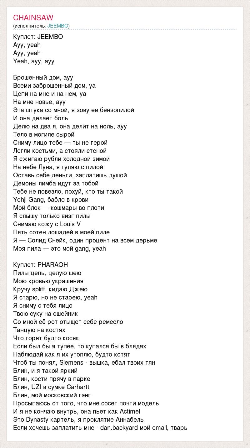 Куплет: JEEMBO Ayy, yeah Ayy, yeah Yeah, ayy, ayy Брошенный дом, ayy Всеми заброшенный дом, ya Цепи на мне и на нем, ya На мне новье, ayy Эта штука со мной, я зову ее бензопилой И она делает боль Делю на два я, она делит на ноль, ayy Тело в могиле сырой Сниму лицо тебе — ты не герой Легли костьми, а стояли стеной Я сжигаю рубли холодной зимой На небе Луна, я гуляю с пилой Оставь себе деньги, заплатишь душой Демоны лимба идут за тобой Тебе не повезло, похуй, кто ты такой Yohji Gang, бабло в крови Мой блок — кошмары во плоти Я слышу только визг пилы Снимаю кожу с Louis V Пять сотен лошадей в моей пиле Я — Солид Снейк, один процент на всем дерьме Моя пила — это мой gang, yeah Куплет: PHARAOH Пилы цепь, целую шею Мою кровью украшения Кручу spliff, кидаю Джею Я старю, но не старею, yeah Я сниму с тебя лицо Твою суку на ошейник Со мной её рот отыщет себе ремесло Танцую на костях Что горят будто косяк Если был бы я тупее, то купался бы в блядях Наблюдай как я их утоплю, будто котят Чтоб ты понял, Siemens - вышка, ебал твоих тян Блин, и я такой яркий Блин, кости прячу в парке Блин, UZI в сумке Carhartt Блин, мой московский гэнг Просыпаюсь от того, что мне сосет почти модель И я не кончаю внутрь, она пьет как Actimel Это Dynasty картель, я проклятие Аннабель Если хочешь заплатить мне - dan.backyard мой email, тварь