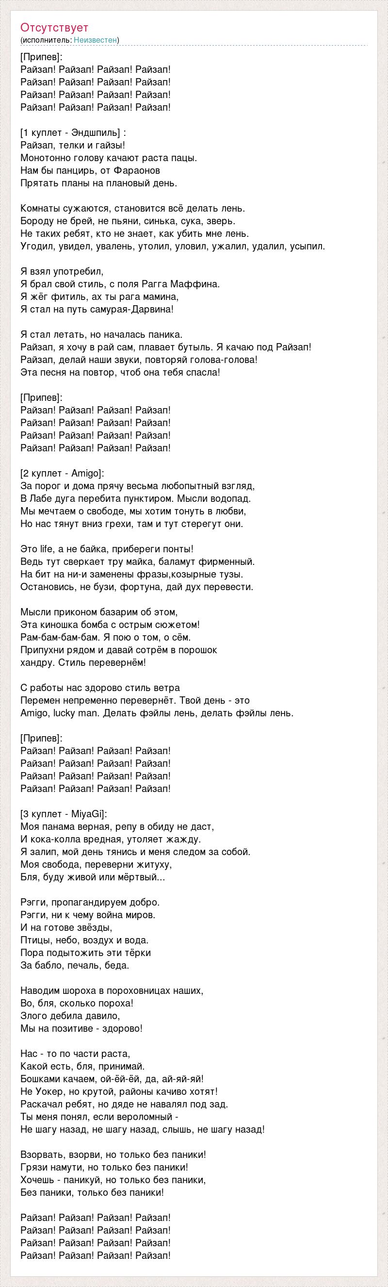 [Припев]: Райзап! Райзап! Райзап! Райзап! Райзап! Райзап! Райзап! Райзап! Райзап! Райзап! Райзап! Райзап! Райзап! Райзап! Райзап! Райзап! [1 куплет - Эндшпиль] : Райзап, телки и гайзы! Монотонно голову качают раста пацы. Нам бы панцирь, от Фараонов Прятать планы на плановый день. Комнаты сужаются, становится всё делать лень. Бороду не брей, не пьяни, синька, сука, зверь. Не таких ребят, кто не знает, как убить мне лень. Угодил, увидел, увалень, утолил, уловил, ужалил, удалил, усыпил. Я взял употребил, Я брал свой стиль, с поля Рагга Маффина. Я жёг фитиль, ах ты рага мамина, Я стал на путь самурая-Дарвина! Я стал летать, но началась паника. Райзап, я хочу в рай сам, плавает бутыль. Я качаю под Райзап! Райзап, делай наши звуки, повторяй голова-голова! Эта песня на повтор, чтоб она тебя спасла! [Припев]: Райзап! Райзап! Райзап! Райзап! Райзап! Райзап! Райзап! Райзап! Райзап! Райзап! Райзап! Райзап! Райзап! Райзап! Райзап! Райзап! [2 куплет - Amigo]: За порог и дома прячу весьма любопытный взгляд, В Лабе дуга перебита пунктиром. Мысли водопад. Мы мечтаем о свободе, мы хотим тонуть в любви, Но нас тянут вниз грехи, там и тут стерегут они. Это life, а не байка, прибереги понты! Ведь тут сверкает тру майка, баламут фирменный. На бит на ни-и заменены фразы,козырные тузы. Остановись, не бузи, фортуна, дай дух перевести. Мысли приконом базарим об этом, Эта киношка бомба с острым сюжетом! Рам-бам-бам-бам. Я пою о том, о сём. Припухни рядом и давай сотрём в порошок хандру. Стиль перевернём! С работы нас здорово стиль ветра Перемен непременно перевернёт. Твой день - это Amigo, lucky man. Делать фэйлы лень, делать фэйлы лень. [Припев]: Райзап! Райзап! Райзап! Райзап! Райзап! Райзап! Райзап! Райзап! Райзап! Райзап! Райзап! Райзап! Райзап! Райзап! Райзап! Райзап! [3 куплет - MiyaGi]: Моя панама верная, репу в обиду не даст, И кока-колла вредная, утоляет жажду. Я залип, мой день тянись и меня следом за собой. Моя свобода, переверни житуху, Бля, буду живой или мёртвый... Рэгги, пропагандируем добро. Рэгги, ни к чему война миров. И на готове звёзды, Птицы, небо, воздух и вода. Пора подытожить эти тёрки За бабло, печаль, беда. Наводим шороха в пороховницах наших, Во, бля, сколько пороха! Злого дебила давило, Мы на позитиве - здорово! Нас - то по части раста, Какой есть, бля, принимай. Бошками качаем, ой-ёй-ёй, да, ай-яй-яй! Не Уокер, но крутой, районы качиво хотят! Раскачал ребят, но дяде не навалял под зад. Ты меня понял, если вероломный - Не шагу назад, не шагу назад, слышь, не шагу назад! Взорвать, взорви, но только без паники! Грязи намути, но только без паники! Хочешь - паникуй, но только без паники, Без паники, только без паники! Райзап! Райзап! Райзап! Райзап! Райзап! Райзап! Райзап! Райзап! Райзап! Райзап! Райзап! Райзап! Райзап! Райзап! Райзап! Райзап!