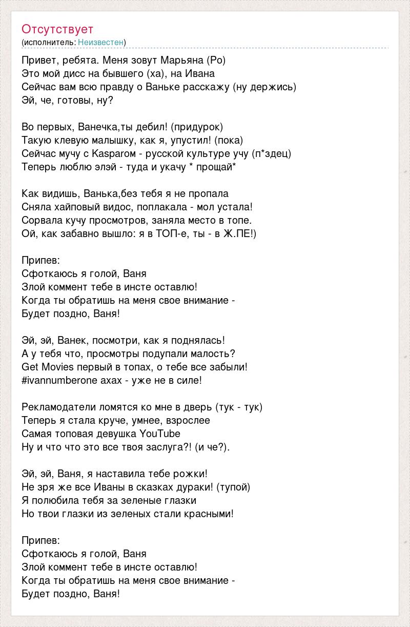 Привет, ребята. Меня зовут Марьяна (Ро) Это мой дисс на бывшего (ха), на Ивана Сейчас вам всю правду о Ваньке расскажу (ну держись) Эй, че, готовы, ну? Во первых, Ванечка,ты дебил! (придурок) Такую клевую малышку, как я, упустил! (пока) Сейчас мучу с Kasparом - русской культуре учу (п*здец) Теперь люблю элэй - туда и укачу * прощай* Как видишь, Ванька,без тебя я не пропала Сняла хайповый видос, поплакала - мол устала! Сорвала кучу просмотров, заняла место в топе. Ой, как забавно вышло: я в ТОП-е, ты - в Ж.ПЕ!) Припев: Сфоткаюсь я голой, Ваня Злой коммент тебе в инсте оставлю! Когда ты обратишь на меня свое внимание - Будет поздно, Ваня! Эй, эй, Ванек, посмотри, как я поднялась! А у тебя что, просмотры подупали малость? Get Movies первый в топах, о тебе все забыли! #ivannumberone ахах - уже не в силе! Рекламодатели ломятся ко мне в дверь (тук - тук) Теперь я стала круче, умнее, взрослее Самая топовая девушка YouTube Ну и что что это все твоя заслуга?! (и че?). Эй, эй, Ваня, я наставила тебе рожки! Не зря же все Иваны в сказках дураки! (тупой) Я полюбила тебя за зеленые глазки Но твои глазки из зеленых стали красными! Припев: Сфоткаюсь я голой, Ваня Злой коммент тебе в инсте оставлю! Когда ты обратишь на меня свое внимание - Будет поздно, Ваня!
