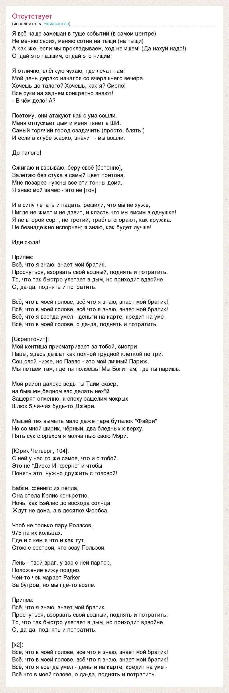 Я всё чаще замешан в гуще событий (в самом центре) Не меняю своих, меняю сотни на тыщи (на тыщи) А как же, если мы прокладываем, ход не ищем! (Да нахуй надо!) Отдай это падшим, отдай это нищим! Я отлично, влёгкую чухаю, где лечат нам! Мой день дерзко начался со вчерашнего вечера. Хочешь до талого? Хочешь, как я? Смело! Все суки на заднем конкретно знают! - В чём дело! А? Поэтому, они атакуют как с ума сошли. Меня отпускает дым и меня тянет в ШИ. Самый горячий город озадачить (просто, блять!) И если в клубе жарко, значит - мы вошли. До талого! Сжигаю и взрываю, беру своё [бетонно], Залетаю без стука в самый цвет притона. Мне позарез нужны все эти тонны дома. Я знаю мой замес - это не [гон] И в силу летать и падать, решили, что мы не хуже, Нигде не жмет и не давит, и класть что мы висим в однушке! Я не второй сорт, не третий; траблы сгорают, как кружка. Не безнадежно испорчен; я знаю, как будет лучше! Иди сюда! Припев: Всё, что я знаю, знает мой братик. Проснуться, взорвать свой водный, поднять и потратить. То, что так быстро улетает в дым, но приходит вдвойне О, да-да, поднять и потратить. Всё, что в моей голове, всё что я знаю, знает мой братик! Всё, что в моей голове, всё что я знаю, знает мой братик! Всё, что я всегда умел - деньги на карте, кредит на уме - Всё, что в моей голове, о да-да, поднять и потратить. [Скриптонит]: Мой кентиша присматривает за тобой, смотри Пацы, здесь дышат как полной грудной клеткой по три. Соц.слой ниже, но Павло - это мой личный Париж. Мы летаем там, где ты ползёшь! Мы Боги там, где ты паришь. Мой район далеко ведь ты Тайм-сквер, на бывшем,бедном вас делать нех*й Защерят отменно, к спеху защелим мокрых Шлюх 5,чи-чиз будь-то Джери. Мышей тех вымыть мало даже паре бутылок "Фэйри" Но со мной ширик, чёрный, два бледных к верху. Пять сук с орехом я молча пью свою Мэри. [Юрик Четверг, 104]: С ней у нас то же самое, что и с тобой. Это не "Диско Инферно" и чтобы Понять это, нужно дружить с головой! Бабки, феникс из пепла, Она спела Келис конкретно. Ночь, как Бэйлис до восхода солнца Ждут не дома, а в десятке Форбса. Чтоб не только пару Роллсов, 975 на их кольцах. Где и с кем я что и как тут, Стою с сестрой, что зову Пользой. Лень - твой враг, у вас с ней партер, Положение вижу поздно, Чей-то чек марает Parker За бугром, но мы где-то возле. Припев: Всё, что я знаю, знает мой братик. Проснуться, взорвать свой водный, поднять и потратить. То, что так быстро улетает в дым, но приходит вдвойне. О, да-да, поднять и потратить. [x2]: Всё, что в моей голове, всё что я знаю, знает мой братик! Всё, что в моей голове, всё что я знаю, знает мой братик! Всё, что я всегда умел - деньги на карте, кредит на уме - Всё что в моей голове, о да-да, поднять и потратить.