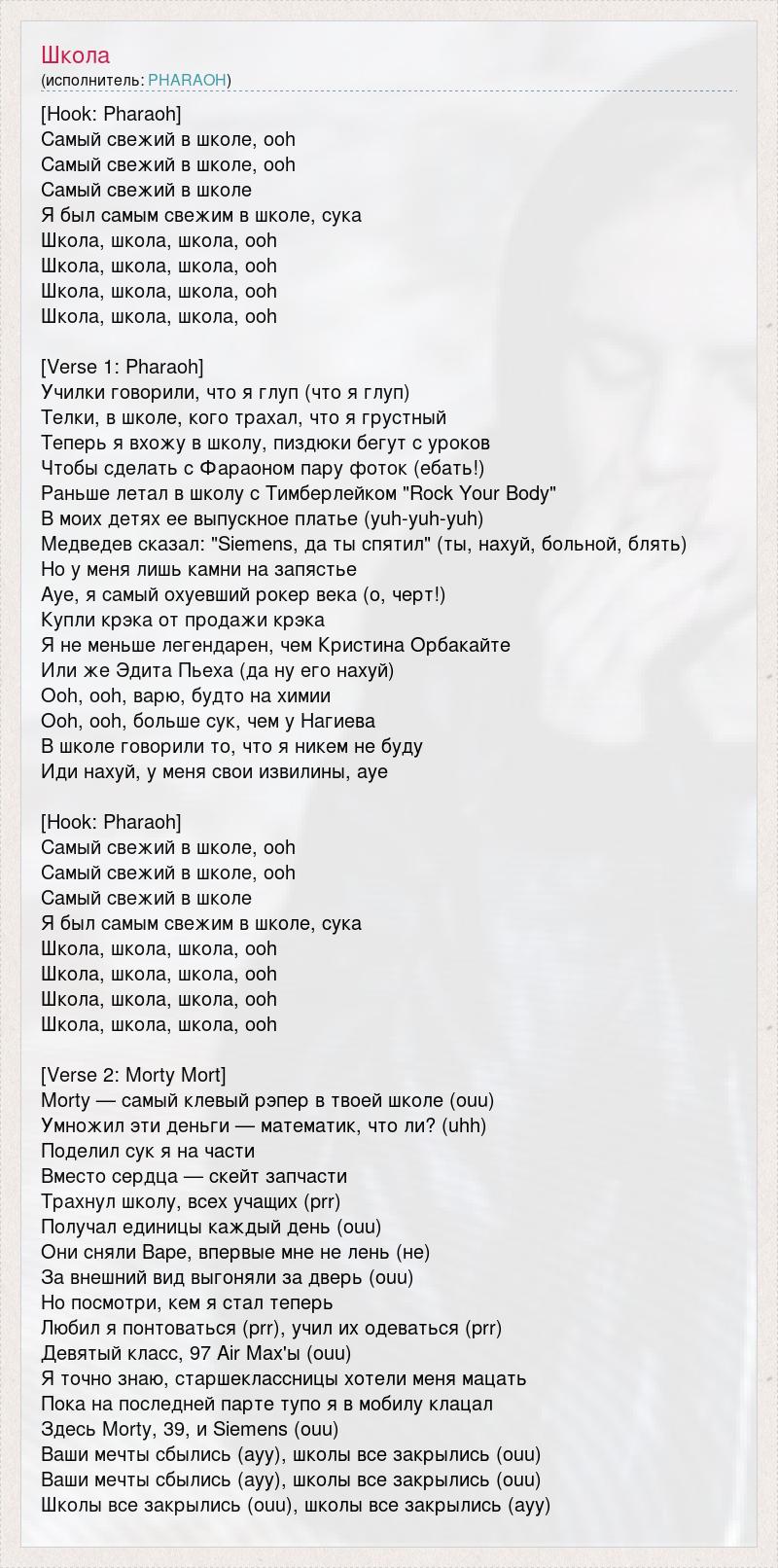 [Hook: Pharaoh] Самый свежий в школе, ooh Самый свежий в школе, ooh Самый свежий в школе Я был самым свежим в школе, сука Школа, школа, школа, ooh Школа, школа, школа, ooh Школа, школа, школа, ooh Школа, школа, школа, ooh [Verse 1: Pharaoh] Училки говорили, что я глуп (что я глуп) Телки, в школе, кого трахал, что я грустный Теперь я вхожу в школу, пиздюки бегут с уроков Чтобы сделать с Фараоном пару фоток (ебать!) Раньше летал в школу с Тимберлейком "Rock Your Body" В моих детях ее выпускное платье (yuh-yuh-yuh) Медведев сказал: "Siemens, да ты спятил" (ты, нахуй, больной, блять) Но у меня лишь камни на запястье Aye, я самый охуевший рокер века (о, черт!) Купли крэка от продажи крэка Я не меньше легендарен, чем Кристина Орбакайте Или же Эдита Пьеха (да ну его нахуй) Ooh, ooh, варю, будто на химии Ooh, ooh, больше сук, чем у Нагиева В школе говорили то, что я никем не буду Иди нахуй, у меня свои извилины, aye [Hook: Pharaoh] Самый свежий в школе, ooh Самый свежий в школе, ooh Самый свежий в школе Я был самым свежим в школе, сука Школа, школа, школа, ooh Школа, школа, школа, ooh Школа, школа, школа, ooh Школа, школа, школа, ooh [Verse 2: Morty Mort] Morty — самый клевый рэпер в твоей школе (ouu) Умножил эти деньги — математик, что ли? (uhh) Поделил сук я на части Вместо сердца — скейт запчасти Трахнул школу, всех учащих (prr) Получал единицы каждый день (ouu) Они сняли Bape, впервые мне не лень (не) За внешний вид выгоняли за дверь (ouu) Но посмотри, кем я стал теперь Любил я понтоваться (prr), учил их одеваться (prr) Девятый класс, 97 Air Max'ы (ouu) Я точно знаю, старшеклассницы хотели меня мацать Пока на последней парте тупо я в мобилу клацал Здесь Morty, 39, и Siemens (ouu) Ваши мечты сбылись (ayy), школы все закрылись (ouu) Ваши мечты сбылись (ayy), школы все закрылись (ouu) Школы все закрылись (ouu), школы все закрылись (ayy)