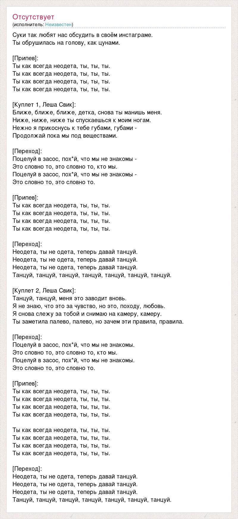 Cуки так любят нас обсудить в своём инстаграме. Ты обрушилась на голову, как цунами. [Припев]: Ты как всегда неодета, ты, ты, ты. Ты как всегда неодета, ты, ты, ты. Ты как всегда неодета, ты, ты, ты. Ты как всегда неодета, ты, ты, ты. [Куплет 1, Леша Свик]: Ближе, ближе, ближе, детка, снова ты манишь меня. Ниже, ниже, ниже ты спускаешься к моим ногам. Нежно я прикоснусь к тебе губами, губами - Продолжай пока мы под веществами. [Переход]: Поцелуй в засос, пох*й, что мы не знакомы - Это словно то, это словно то, кто мы. Поцелуй в засос, пох*й, что мы не знакомы - Это словно то, это словно то. [Припев]: Ты как всегда неодета, ты, ты, ты. Ты как всегда неодета, ты, ты, ты. Ты как всегда неодета, ты, ты, ты. Ты как всегда неодета, ты, ты, ты. [Переход]: Неодета, ты не одета, теперь давай танцуй. Неодета, ты не одета, теперь давай танцуй. Неодета, ты не одета, теперь давай танцуй. Танцуй, танцуй, танцуй, танцуй, танцуй, танцуй, танцуй. [Куплет 2, Леша Свик]: Танцуй, танцуй, меня это заводит вновь. Я не знаю, что это за чувство, но это, походу, любовь. Я снова слежу за тобой и снимаю на камеру, камеру. Ты заметила палево, палево, но зачем эти правила, правила. [Переход]: Поцелуй в засос, пох*й, что мы не знакомы. Это словно то, это словно то, кто мы. Поцелуй в засос, пох*й, что мы не знакомы. Это словно то, это словно то. [Припев]: Ты как всегда неодета, ты, ты, ты. Ты как всегда неодета, ты, ты, ты. Ты как всегда неодета, ты, ты, ты. Ты как всегда неодета, ты, ты, ты. Ты как всегда неодета, ты, ты, ты. Ты как всегда неодета, ты, ты, ты. Ты как всегда неодета, ты, ты, ты. Ты как всегда неодета, ты, ты, ты. [Переход]: Неодета, ты не одета, теперь давай танцуй. Неодета, ты не одета, теперь давай танцуй. Неодета, ты не одета, теперь давай танцуй. Танцуй, танцуй, танцуй, танцуй, танцуй, танцуй, танцуй.