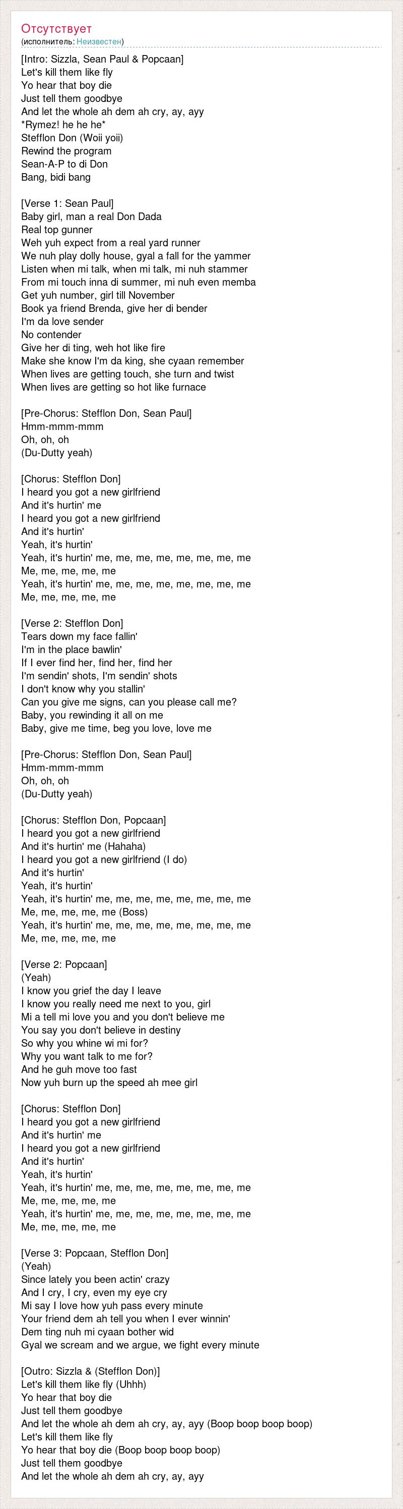 [Intro: Sizzla, Sean Paul & Popcaan] Let's kill them like fly Yo hear that boy die Just tell them goodbye And let the whole ah dem ah cry, ay, ayy *Rymez! he he he* Stefflon Don (Woii yoii) Rewind the program Sean-A-P to di Don Bang, bidi bang [Verse 1: Sean Paul] Baby girl, man a real Don Dada Real top gunner Weh yuh expect from a real yard runner We nuh play dolly house, gyal a fall for the yammer Listen when mi talk, when mi talk, mi nuh stammer From mi touch inna di summer, mi nuh even memba Get yuh number, girl till November Book ya friend Brenda, give her di bender I'm da love sender No contender Give her di ting, weh hot like fire Make she know I'm da king, she cyaan remember When lives are getting touch, she turn and twist When lives are getting so hot like furnace [Pre-Chorus: Stefflon Don, Sean Paul] Hmm-mmm-mmm Oh, oh, oh (Du-Dutty yeah) [Chorus: Stefflon Don] I heard you got a new girlfriend And it's hurtin' me I heard you got a new girlfriend And it's hurtin' Yeah, it's hurtin' Yeah, it's hurtin' me, me, me, me, me, me, me, me Me, me, me, me, me Yeah, it's hurtin' me, me, me, me, me, me, me, me Me, me, me, me, me [Verse 2: Stefflon Don] Tears down my face fallin' I'm in the place bawlin' If I ever find her, find her, find her I'm sendin' shots, I'm sendin' shots I don't know why you stallin' Can you give me signs, can you please call me? Baby, you rewinding it all on me Baby, give me time, beg you love, love me [Pre-Chorus: Stefflon Don, Sean Paul] Hmm-mmm-mmm Oh, oh, oh (Du-Dutty yeah) [Chorus: Stefflon Don, Popcaan] I heard you got a new girlfriend And it's hurtin' me (Hahaha) I heard you got a new girlfriend (I do) And it's hurtin' Yeah, it's hurtin' Yeah, it's hurtin' me, me, me, me, me, me, me, me Me, me, me, me, me (Boss) Yeah, it's hurtin' me, me, me, me, me, me, me, me Me, me, me, me, me [Verse 2: Popcaan] (Yeah) I know you grief the day I leave I know you really need me next to you, girl Mi a tell mi love you and you don't believe me You say you don't believe in destiny So why you whine wi mi for? Why you want talk to me for? And he guh move too fast Now yuh burn up the speed ah mee girl [Chorus: Stefflon Don] I heard you got a new girlfriend And it's hurtin' me I heard you got a new girlfriend And it's hurtin' Yeah, it's hurtin' Yeah, it's hurtin' me, me, me, me, me, me, me, me Me, me, me, me, me Yeah, it's hurtin' me, me, me, me, me, me, me, me Me, me, me, me, me [Verse 3: Popcaan, Stefflon Don] (Yeah) Since lately you been actin' crazy And I cry, I cry, even my eye cry Mi say I love how yuh pass every minute Your friend dem ah tell you when I ever winnin' Dem ting nuh mi cyaan bother wid Gyal we scream and we argue, we fight every minute [Outro: Sizzla & (Stefflon Don)] Let's kill them like fly (Uhhh) Yo hear that boy die Just tell them goodbye And let the whole ah dem ah cry, ay, ayy (Boop boop boop boop) Let's kill them like fly Yo hear that boy die (Boop boop boop boop) Just tell them goodbye And let the whole ah dem ah cry, ay, ayy