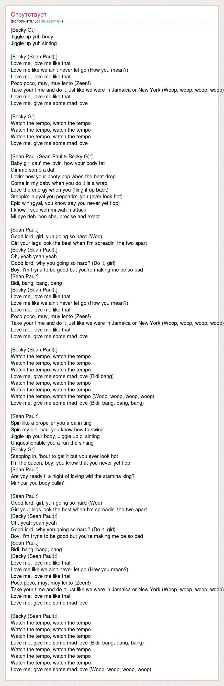 [Becky G:] Jiggle up yuh body Jiggle up yuh sinting [Becky (Sean Paul):] Love me, love me like that Love me like we ain't never let go (How you mean?) Love me, love me like that Poco poco, muy, muy lento (Zeen!) Take your time and do it just like we were in Jamaica or New York (Woop, woop, woop, woop) Love me, love me like that Love me, give me some mad love [Becky G:] Watch the tempo, watch the tempo Watch the tempo, watch the tempo Watch the tempo, watch the tempo Love me, give me some mad love [Sean Paul (Sean Paul & Becky G):] Baby girl cau' me lovin' how your body fat Gimme some a dat Lovin' how your booty pop when the beat drop Come in my baby when you do it is a wrap Love the energy when you (fling it up back) Steppin' in gyal you pepparin', you (ever look hot) Epic win (gyal, you know say you never yet flop) I know I see weh mi wah fi attack Mi eye deh 'pon she, precise and exact [Sean Paul:] Good lord, girl, yuh going so hard (Woo) Girl your legs look the best when I'm spreadin' the two apart [Becky (Sean Paul):] Oh, yeah yeah yeah Good lord, why you going so hard? (Do it, girl) Boy, I'm tryna to be good but you're making me be so bad [Sean Paul:] Bidi, bang, bang, bang [Becky (Sean Paul):] Love me, love me like that Love me like we ain't never let go (How you mean?) Love me, love me like that Poco poco, muy, muy lento (Zeen!) Take your time and do it just like we were in Jamaica or New York (Woop, woop, woop, woop) Love me, love me like that Love me, give me some mad love [Becky (Sean Paul):] Watch the tempo, watch the tempo Watch the tempo, watch the tempo Watch the tempo, watch the tempo Love me, give me some mad love (Bidi bang) Watch the tempo, watch the tempo Watch the tempo, watch the tempo Watch the tempo, watch the tempo (Woop, woop, woop, woop) Love me, give me some mad love (Bidi, bang, bang, bang) [Sean Paul:] Spin like a propeller you a da in ting Spin my girl, cau' you know how to swing Jiggle up your body, Jiggle up di sinting Unquestionable you a run the sinting [Becky G:] Stepping in, 'bout to get it but you ever look hot I'm the queen, boy, you know that you never yet flop [Sean Paul:] Are yoy ready fi a night of loving wid the stamina king? Mi hear you body callin' [Sean Paul:] Good lord, girl, yuh going so hard (Woo) Girl your legs look the best when I'm spreadin' the two apart [Becky (Sean Paul):] Oh, yeah yeah yeah Good lord, why you going so hard? (Do it, girl) Boy, I'm tryna to be good but you're making me be so bad [Sean Paul:] Bidi, bang, bang, bang [Becky (Sean Paul):] Love me, love me like that Love me like we ain't never let go (How you mean?) Love me, love me like that Poco poco, muy, muy lento (Zeen!) Take your time and do it just like we were in Jamaica or New York (Woop, woop, woop, woop) Love me, love me like that Love me, give me some mad love [Becky (Sean Paul):] Watch the tempo, watch the tempo Watch the tempo, watch the tempo Watch the tempo, watch the tempo Love me, give me some mad love (Bidi, bang, bang, bang) Watch the tempo, watch the tempo Watch the tempo, watch the tempo Watch the tempo, watch the tempo Love me, give me some mad love (Woop, woop, woop, woop)