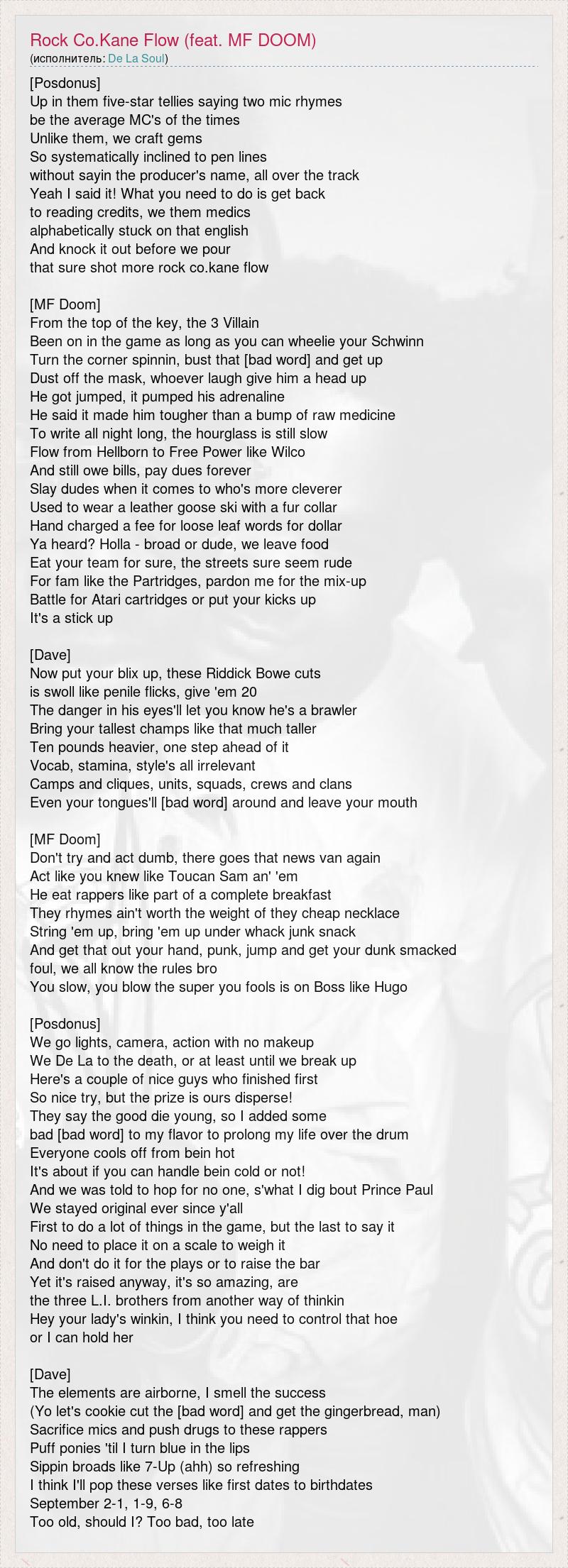 [Posdonus] Up in them five-star tellies saying two mic rhymes be the average MC's of the times Unlike them, we craft gems So systematically inclined to pen lines without sayin the producer's name, all over the track Yeah I said it! What you need to do is get back to reading credits, we them medics alphabetically stuck on that english And knock it out before we pour that sure shot more rock co.kane flow [MF Doom] From the top of the key, the 3 Villain Been on in the game as long as you can wheelie your Schwinn Turn the corner spinnin, bust that [bad word] and get up Dust off the mask, whoever laugh give him a head up He got jumped, it pumped his adrenaline He said it made him tougher than a bump of raw medicine To write all night long, the hourglass is still slow Flow from Hellborn to Free Power like Wilco And still owe bills, pay dues forever Slay dudes when it comes to who's more cleverer Used to wear a leather goose ski with a fur collar Hand charged a fee for loose leaf words for dollar Ya heard? Holla - broad or dude, we leave food Eat your team for sure, the streets sure seem rude For fam like the Partridges, pardon me for the mix-up Battle for Atari cartridges or put your kicks up It's a stick up [Dave] Now put your blix up, these Riddick Bowe cuts is swoll like penile flicks, give 'em 20 The danger in his eyes'll let you know he's a brawler Bring your tallest champs like that much taller Ten pounds heavier, one step ahead of it Vocab, stamina, style's all irrelevant Camps and cliques, units, squads, crews and clans Even your tongues'll [bad word] around and leave your mouth [MF Doom] Don't try and act dumb, there goes that news van again Act like you knew like Toucan Sam an' 'em He eat rappers like part of a complete breakfast They rhymes ain't worth the weight of they cheap necklace String 'em up, bring 'em up under whack junk snack And get that out your hand, punk, jump and get your dunk smacked foul, we all know the rules bro You slow, you blow the super you fools is on Boss like Hugo [Posdonus] We go lights, camera, action with no makeup We De La to the death, or at least until we break up Here's a couple of nice guys who finished first So nice try, but the prize is ours disperse! They say the good die young, so I added some bad [bad word] to my flavor to prolong my life over the drum Everyone cools off from bein hot It's about if you can handle bein cold or not! And we was told to hop for no one, s'what I dig bout Prince Paul We stayed original ever since y'all First to do a lot of things in the game, but the last to say it No need to place it on a scale to weigh it And don't do it for the plays or to raise the bar Yet it's raised anyway, it's so amazing, are the three L.I. brothers from another way of thinkin Hey your lady's winkin, I think you need to control that hoe or I can hold her [Dave] The elements are airborne, I smell the success (Yo let's cookie cut the [bad word] and get the gingerbread, man) Sacrifice mics and push drugs to these rappers Puff ponies 'til I turn blue in the lips Sippin broads like 7-Up (ahh) so refreshing I think I'll pop these verses like first dates to birthdates September 2-1, 1-9, 6-8 Too old, should I? Too bad, too late