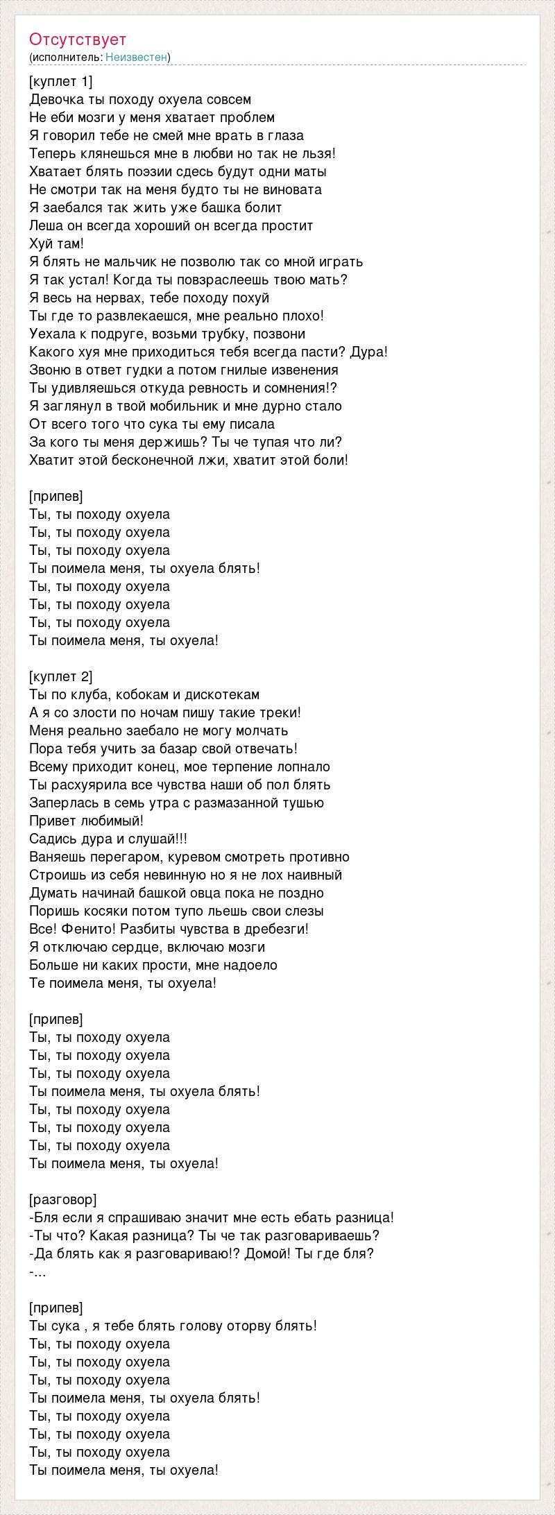 [куплет 1] Девочка ты походу охуела совсем Не еби мозги у меня хватает проблем Я говорил тебе не смей мне врать в глаза Теперь клянешься мне в любви но так не льзя! Хватает блять поэзии сдесь будут одни маты Не смотри так на меня будто ты не виновата Я заебался так жить уже башка болит Леша он всегда хороший он всегда простит Хуй там! Я блять не мальчик не позволю так со мной играть Я так устал! Когда ты повзраслеешь твою мать? Я весь на нервах, тебе походу похуй Ты где то развлекаешся, мне реально плохо! Уехала к подруге, возьми трубку, позвони Какого хуя мне приходиться тебя всегда пасти? Дура! Звоню в ответ гудки а потом гнилые извенения Ты удивляешься откуда ревность и сомнения!? Я заглянул в твой мобильник и мне дурно стало От всего того что сука ты ему писала За кого ты меня держишь? Ты че тупая что ли? Хватит этой бесконечной лжи, хватит этой боли! [припев] Ты, ты походу охуела Ты, ты походу охуела Ты, ты походу охуела Ты поимела меня, ты охуела блять! Ты, ты походу охуела Ты, ты походу охуела Ты, ты походу охуела Ты поимела меня, ты охуела! [куплет 2] Ты по клуба, кобокам и дискотекам А я со злости по ночам пишу такие треки! Меня реально заебало не могу молчать Пора тебя учить за базар свой отвечать! Всему приходит конец, мое терпение лопнало Ты расхуярила все чувства наши об пол блять Заперлась в семь утра с размазанной тушью Привет любимый! Садись дура и слушай!!! Ваняешь перегаром, куревом смотреть противно Строишь из себя невинную но я не лох наивный Думать начинай башкой овца пока не поздно Поришь косяки потом тупо льешь свои слезы Все! Фенито! Разбиты чувства в дребезги! Я отключаю сердце, включаю мозги Больше ни каких прости, мне надоело Те поимела меня, ты охуела! [припев] Ты, ты походу охуела Ты, ты походу охуела Ты, ты походу охуела Ты поимела меня, ты охуела блять! Ты, ты походу охуела Ты, ты походу охуела Ты, ты походу охуела Ты поимела меня, ты охуела! [разговор] -Бля если я спрашиваю значит мне есть ебать разница! -Ты что? Какая разница? Ты че так разговариваешь? -Да блять как я разговариваю!? Домой! Ты где бля? -... [припев] Ты сука , я тебе блять голову оторву блять! Ты, ты походу охуела Ты, ты походу охуела Ты, ты походу охуела Ты поимела меня, ты охуела блять! Ты, ты походу охуела Ты, ты походу охуела Ты, ты походу охуела Ты поимела меня, ты охуела!