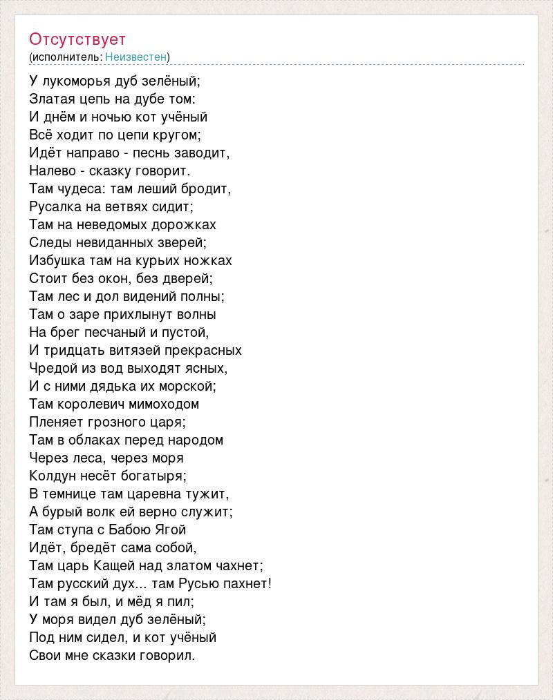 У лукоморья дуб зелёный; Златая цепь на дубе том: И днём и ночью кот учёный Всё ходит по цепи кругом; Идёт направо - песнь заводит, Налево - сказку говорит. Там чудеса: там леший бродит, Русалка на ветвях сидит; Там на неведомых дорожках Следы невиданных зверей; Избушка там на курьих ножках Стоит без окон, без дверей; Там лес и дол видений полны; Там о заре прихлынут волны На брег песчаный и пустой, И тридцать витязей прекрасных Чредой из вод выходят ясных, И с ними дядька их морской; Там королевич мимоходом Пленяет грозного царя; Там в облаках перед народом Через леса, через моря Колдун несёт богатыря; В темнице там царевна тужит, А бурый волк ей верно служит; Там ступа с Бабою Ягой Идёт, бредёт сама собой, Там царь Кащей над златом чахнет; Там русский дух... там Русью пахнет! И там я был, и мёд я пил; У моря видел дуб зелёный; Под ним сидел, и кот учёный Свои мне сказки говорил.