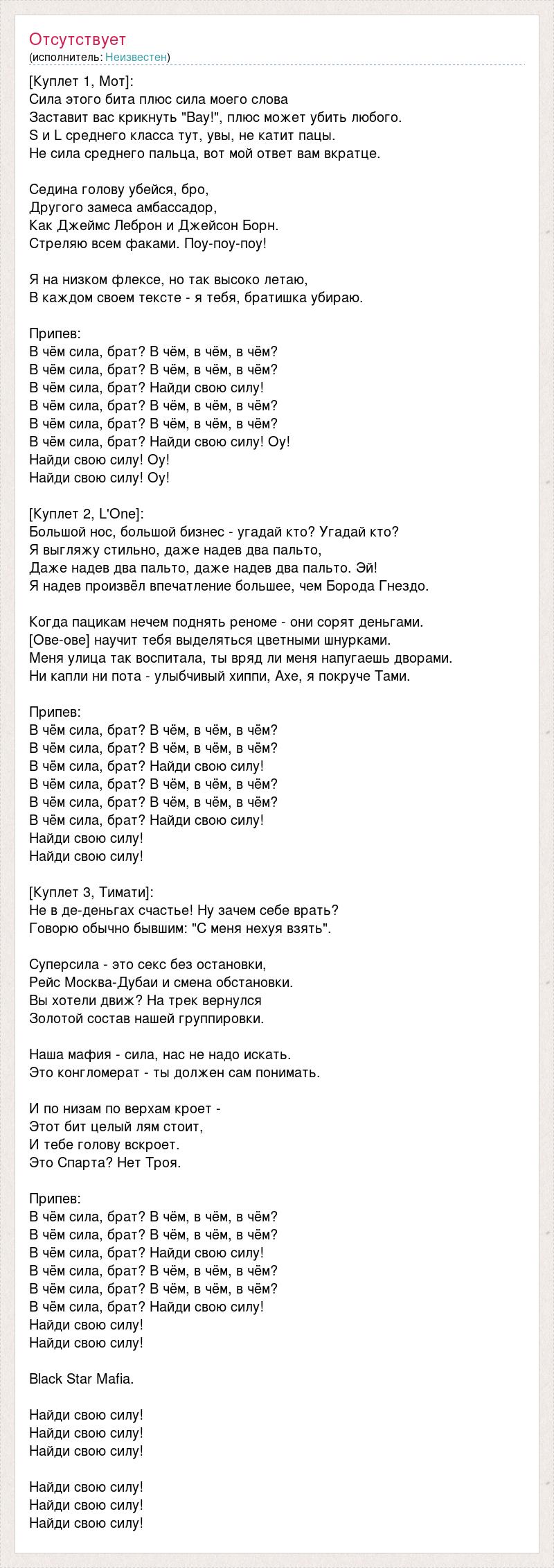 [Куплет 1, Мот]: Сила этого бита плюс сила моего слова Заставит вас крикнуть "Вау!", плюс может убить любого. S и L среднего класса тут, увы, не катит пацы. Не сила среднего пальца, вот мой ответ вам вкратце. Седина голову убейся, бро, Другого замеса амбассадор, Как Джеймс Леброн и Джейсон Борн. Стреляю всем факами. Поу-поу-поу! Я на низком флексе, но так высоко летаю, В каждом своем тексте - я тебя, братишка убираю. Припев: В чём сила, брат? В чём, в чём, в чём? В чём сила, брат? В чём, в чём, в чём? В чём сила, брат? Найди свою силу! В чём сила, брат? В чём, в чём, в чём? В чём сила, брат? В чём, в чём, в чём? В чём сила, брат? Найди свою силу! Оу! Найди свою силу! Оу! Найди свою силу! Оу! [Куплет 2, L'One]: Большой нос, большой бизнес - угадай кто? Угадай кто? Я выгляжу стильно, даже надев два пальто, Даже надев два пальто, даже надев два пальто. Эй! Я надев произвёл впечатление большее, чем Борода Гнездо. Когда пацикам нечем поднять реноме - они сорят деньгами. [Ове-ове] научит тебя выделяться цветными шнурками. Меня улица так воспитала, ты вряд ли меня напугаешь дворами. Ни капли ни пота - улыбчивый хиппи, Axe, я покруче Тами. Припев: В чём сила, брат? В чём, в чём, в чём? В чём сила, брат? В чём, в чём, в чём? В чём сила, брат? Найди свою силу! В чём сила, брат? В чём, в чём, в чём? В чём сила, брат? В чём, в чём, в чём? В чём сила, брат? Найди свою силу! Найди свою силу! Найди свою силу! [Куплет 3, Тимати]: Не в де-деньгах счастье! Ну зачем себе врать? Говорю обычно бывшим: "С меня нехуя взять". Суперсила - это секс без остановки, Рейс Москва-Дубаи и смена обстановки. Вы хотели движ? На трек вернулся Золотой состав нашей группировки. Наша мафия - сила, нас не надо искать. Это конгломерат - ты должен сам понимать. И по низам по верхам кроет - Этот бит целый лям стоит, И тебе голову вскроет. Это Спарта? Нет Троя. Припев: В чём сила, брат? В чём, в чём, в чём? В чём сила, брат? В чём, в чём, в чём? В чём сила, брат? Найди свою силу! В чём сила, брат? В чём, в чём, в чём? В чём сила, брат? В чём, в чём, в чём? В чём сила, брат? Найди свою силу! Найди свою силу! Найди свою силу! Black Star Mafia. Найди свою силу! Найди свою силу! Найди свою силу! Найди свою силу! Найди свою силу! Найди свою силу!