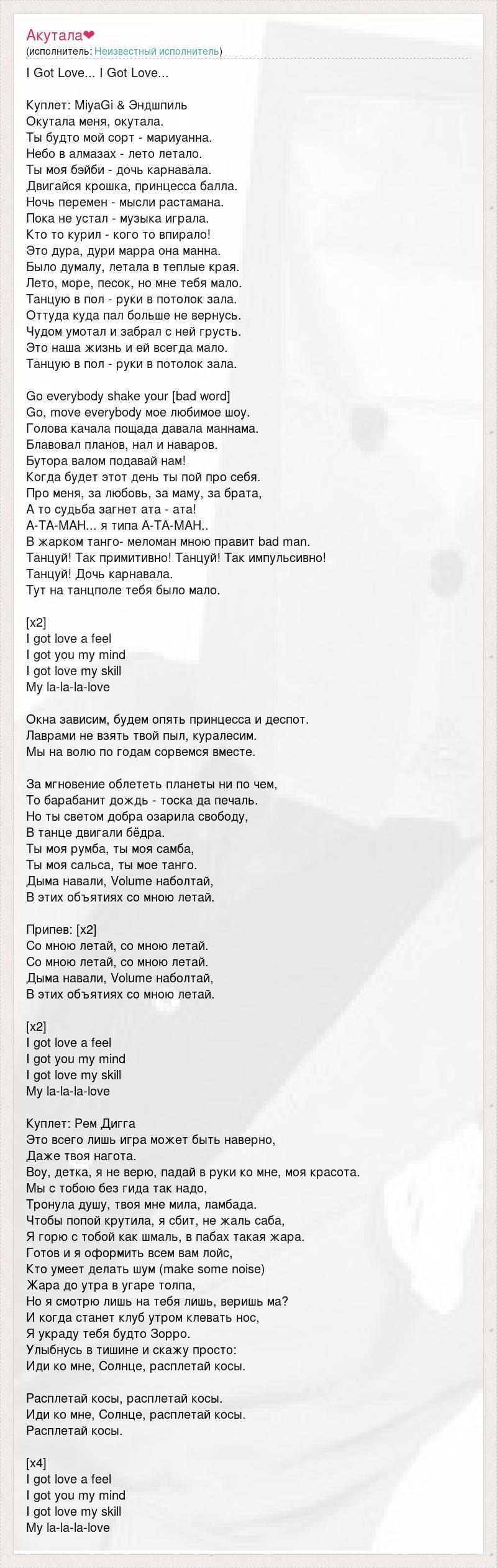 I Got Love... I Got Love... Куплет: MiyaGi & Эндшпиль Окутала меня, окутала. Ты будто мой сорт - мариуанна. Небо в алмазах - лето летало. Ты моя бэйби - дочь карнавала. Двигайся крошка, принцесса балла. Ночь перемен - мысли растамана. Пока не устал - музыка играла. Кто то курил - кого то впирало! Это дура, дури марра она манна. Было думалу, летала в теплые края. Лето, море, песок, но мне тебя мало. Танцую в пол - руки в потолок зала. Оттуда куда пал больше не вернусь. Чудом умотал и забрал с ней грусть. Это наша жизнь и ей всегда мало. Танцую в пол - руки в потолок зала. Go everybody shake your [bad word] Go, move everybody мое любимое шоу. Голова качала пощада давала маннама. Блавовал планов, нал и наваров. Бутора валом подавай нам! Когда будет этот день ты пой про себя. Про меня, за любовь, за маму, за брата, А то судьба загнет ата - ата! А-ТА-МАН... я типа А-ТА-МАН.. В жарком танго- меломан мною правит bad man. Танцуй! Так примитивно! Танцуй! Так импульсивно! Танцуй! Дочь карнавала. Тут на танцполе тебя было мало. [x2] I got love a feel I got you my mind I got love my skill My la-la-la-love Окна зависим, будем опять принцесса и деспот. Лаврами не взять твой пыл, куралесим. Мы на волю по годам сорвемся вместе. За мгновение облететь планеты ни по чем, То барабанит дождь - тоска да печаль. Но ты светом добра озарила свободу, В танце двигали бёдра. Ты моя румба, ты моя самба, Ты моя сальса, ты мое танго. Дыма навали, Volume наболтай, В этих объятиях со мною летай. Припев: [х2] Со мною летай, со мною летай. Со мною летай, со мною летай. Дыма навали, Volume наболтай, В этих объятиях со мною летай. [х2] I got love a feel I got you my mind I got love my skill My la-la-la-love Куплет: Рем Дигга Это всего лишь игра может быть наверно, Даже твоя нагота. Воу, детка, я не верю, падай в руки ко мне, моя красота. Мы с тобою без гида так надо, Тронула душу, твоя мне мила, ламбада. Чтобы попой крутила, я сбит, не жаль саба, Я горю с тобой как шмаль, в пабах такая жара. Готов и я оформить всем вам лойс, Кто умеет делать шум (make some noise) Жара до утра в угаре толпа, Но я смотрю лишь на тебя лишь, веришь ма? И когда станет клуб утром клевать нос, Я украду тебя будто Зорро. Улыбнусь в тишине и скажу просто: Иди ко мне, Солнце, расплетай косы. Расплетай косы, расплетай косы. Иди ко мне, Солнце, расплетай косы. Расплетай косы. [x4] I got love a feel I got you my mind I got love my skill My la-la-la-love