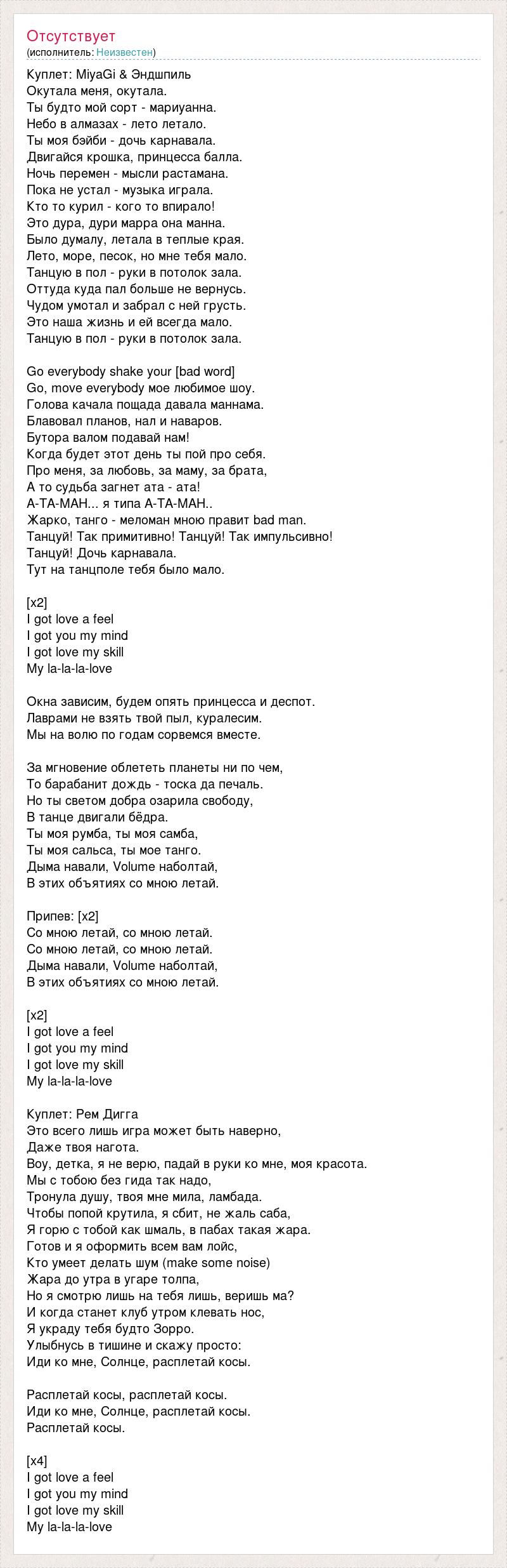 Куплет: MiyaGi & Эндшпиль Окутала меня, окутала. Ты будто мой сорт - мариуанна. Небо в алмазах - лето летало. Ты моя бэйби - дочь карнавала. Двигайся крошка, принцесса балла. Ночь перемен - мысли растамана. Пока не устал - музыка играла. Кто то курил - кого то впирало! Это дура, дури марра она манна. Было думалу, летала в теплые края. Лето, море, песок, но мне тебя мало. Танцую в пол - руки в потолок зала. Оттуда куда пал больше не вернусь. Чудом умотал и забрал с ней грусть. Это наша жизнь и ей всегда мало. Танцую в пол - руки в потолок зала. Go everybody shake your [bad word] Go, move everybody мое любимое шоу. Голова качала пощада давала маннама. Блавовал планов, нал и наваров. Бутора валом подавай нам! Когда будет этот день ты пой про себя. Про меня, за любовь, за маму, за брата, А то судьба загнет ата - ата! А-ТА-МАН... я типа А-ТА-МАН.. Жарко, танго - меломан мною правит bad man. Танцуй! Так примитивно! Танцуй! Так импульсивно! Танцуй! Дочь карнавала. Тут на танцполе тебя было мало. [x2] I got love a feel I got you my mind I got love my skill My la-la-la-love Окна зависим, будем опять принцесса и деспот. Лаврами не взять твой пыл, куралесим. Мы на волю по годам сорвемся вместе. За мгновение облететь планеты ни по чем, То барабанит дождь - тоска да печаль. Но ты светом добра озарила свободу, В танце двигали бёдра. Ты моя румба, ты моя самба, Ты моя сальса, ты мое танго. Дыма навали, Volume наболтай, В этих объятиях со мною летай. Припев: [х2] Со мною летай, со мною летай. Со мною летай, со мною летай. Дыма навали, Volume наболтай, В этих объятиях со мною летай. [х2] I got love a feel I got you my mind I got love my skill My la-la-la-love Куплет: Рем Дигга Это всего лишь игра может быть наверно, Даже твоя нагота. Воу, детка, я не верю, падай в руки ко мне, моя красота. Мы с тобою без гида так надо, Тронула душу, твоя мне мила, ламбада. Чтобы попой крутила, я сбит, не жаль саба, Я горю с тобой как шмаль, в пабах такая жара. Готов и я оформить всем вам лойс, Кто умеет делать шум (make some noise) Жара до утра в угаре толпа, Но я смотрю лишь на тебя лишь, веришь ма? И когда станет клуб утром клевать нос, Я украду тебя будто Зорро. Улыбнусь в тишине и скажу просто: Иди ко мне, Солнце, расплетай косы. Расплетай косы, расплетай косы. Иди ко мне, Солнце, расплетай косы. Расплетай косы. [x4] I got love a feel I got you my mind I got love my skill My la-la-la-love