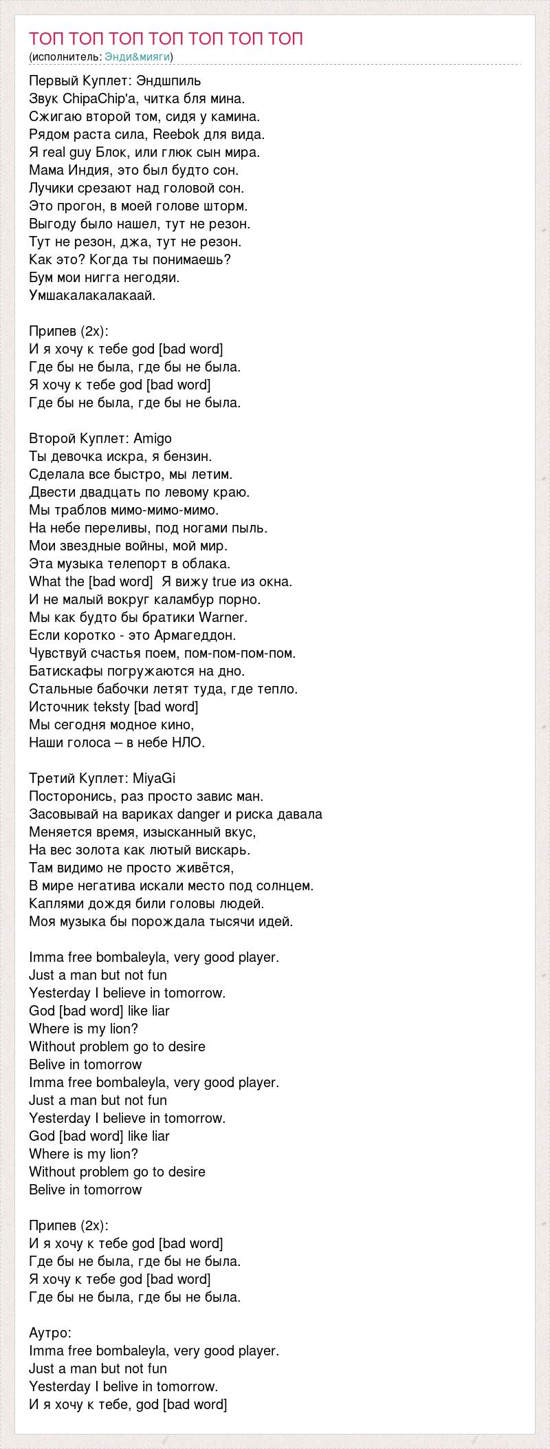 Первый Куплет: Эндшпиль Звук ChipaChip'а, читка бля мина. Сжигаю второй том, сидя у камина. Рядом раста сила, Reebok для вида. Я real guy Блок, или глюк сын мира. Мама Индия, это был будто сон. Лучики срезают над головой сон. Это прогон, в моей голове шторм. Выгоду было нашел, тут не резон. Тут не резон, джа, тут не резон. Как это? Когда ты понимаешь? Бум мои нигга негодяи. Умшакалакалакаай. Припев (2x): И я хочу к тебе god [bad word] Где бы не была, где бы не была. Я хочу к тебе god [bad word] Где бы не была, где бы не была. Второй Куплет: Amigo Ты девочка искра, я бензин. Сделала все быстро, мы летим. Двести двадцать по левому краю. Мы траблов мимо-мимо-мимо. На небе переливы, под ногами пыль. Мои звездные войны, мой мир. Эта музыка телепорт в облака. What the [bad word] Я вижу true из окна. И не малый вокруг каламбур порно. Мы как будто бы братики Warner. Если коротко - это Армагеддон. Чувствуй счастья поем, пом-пом-пом-пом. Батискафы погружаются на дно. Стальные бабочки летят туда, где тепло. Источник teksty [bad word] Мы сегодня модное кино, Наши голоса – в небе НЛО. Третий Куплет: MiyaGi Посторонись, раз просто завис ман. Засовывай на вариках danger и риска давала Меняется время, изысканный вкус, На вес золота как лютый вискарь. Там видимо не просто живётся, В мире негатива искали место под солнцем. Каплями дождя били головы людей. Моя музыка бы порождала тысячи идей. Imma free bombaleyla, very good player. Just a man but not fun Yesterday I believe in tomorrow. God [bad word] like liar Where is my lion? Without problem go to desire Belive in tomorrow Imma free bombaleyla, very good player. Just a man but not fun Yesterday I believe in tomorrow. God [bad word] like liar Where is my lion? Without problem go to desire Belive in tomorrow Припев (2x): И я хочу к тебе god [bad word] Где бы не была, где бы не была. Я хочу к тебе god [bad word] Где бы не была, где бы не была. Аутро: Imma free bombaleyla, very good player. Just a man but not fun Yesterday I belive in tomorrow. И я хочу к тебе, god [bad word]