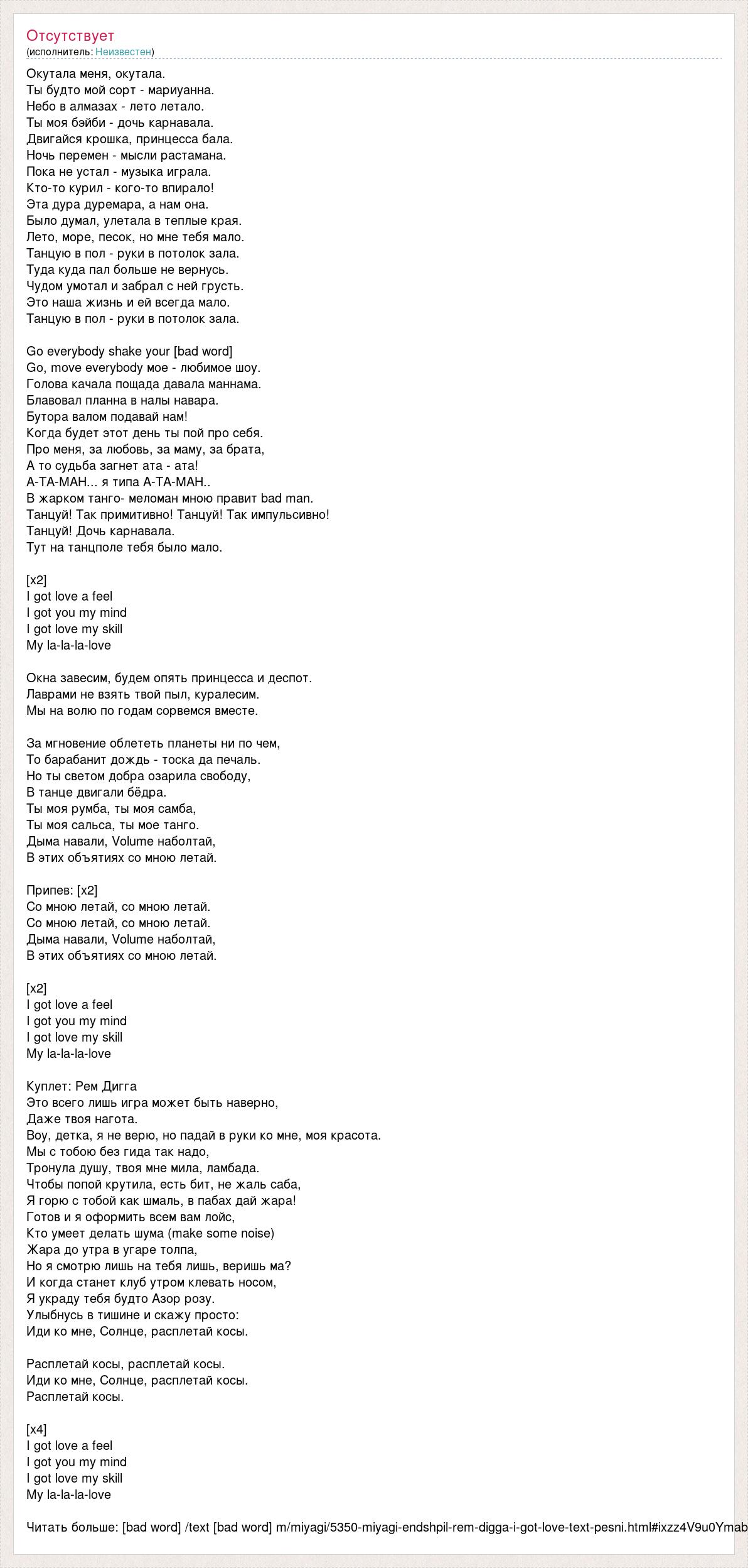 Окутала меня, окутала. Ты будто мой сорт - мариуанна. Небо в алмазах - лето летало. Ты моя бэйби - дочь карнавала. Двигайся крошка, принцесса бала. Ночь перемен - мысли растамана. Пока не устал - музыка играла. Кто-то курил - кого-то впирало! Эта дура дуремара, а нам она. Было думал, улетала в теплые края. Лето, море, песок, но мне тебя мало. Танцую в пол - руки в потолок зала. Туда куда пал больше не вернусь. Чудом умотал и забрал с ней грусть. Это наша жизнь и ей всегда мало. Танцую в пол - руки в потолок зала. Go everybody shake your [bad word] Go, move everybody мое - любимое шоу. Голова качала пощада давала маннама. Блавовал планна в налы навара. Бутора валом подавай нам! Когда будет этот день ты пой про себя. Про меня, за любовь, за маму, за брата, А то судьба загнет ата - ата! А-ТА-МАН... я типа А-ТА-МАН.. В жарком танго- меломан мною правит bad man. Танцуй! Так примитивно! Танцуй! Так импульсивно! Танцуй! Дочь карнавала. Тут на танцполе тебя было мало. [x2] I got love a feel I got you my mind I got love my skill My la-la-la-love Окна завесим, будем опять принцесса и деспот. Лаврами не взять твой пыл, куралесим. Мы на волю по годам сорвемся вместе. За мгновение облететь планеты ни по чем, То барабанит дождь - тоска да печаль. Но ты светом добра озарила свободу, В танце двигали бёдра. Ты моя румба, ты моя самба, Ты моя сальса, ты мое танго. Дыма навали, Volume наболтай, В этих объятиях со мною летай. Припев: [х2] Со мною летай, со мною летай. Со мною летай, со мною летай. Дыма навали, Volume наболтай, В этих объятиях со мною летай. [х2] I got love a feel I got you my mind I got love my skill My la-la-la-love Куплет: Рем Дигга Это всего лишь игра может быть наверно, Даже твоя нагота. Воу, детка, я не верю, но падай в руки ко мне, моя красота. Мы с тобою без гида так надо, Тронула душу, твоя мне мила, ламбада. Чтобы попой крутила, есть бит, не жаль саба, Я горю с тобой как шмаль, в пабах дай жара! Готов и я оформить всем вам лойс, Кто умеет делать шума (make some noise) Жара до утра в угаре толпа, Но я смотрю лишь на тебя лишь, веришь ма? И когда станет клуб утром клевать носом, Я украду тебя будто Азор розу. Улыбнусь в тишине и скажу просто: Иди ко мне, Солнце, расплетай косы. Расплетай косы, расплетай косы. Иди ко мне, Солнце, расплетай косы. Расплетай косы. [x4] I got love a feel I got you my mind I got love my skill My la-la-la-love Читать больше: [bad word] /text [bad word] m/miyagi/5350-miyagi-endshpil-rem-digga-i-got-love-text-pesni.html#ixzz4V9u0Ymab