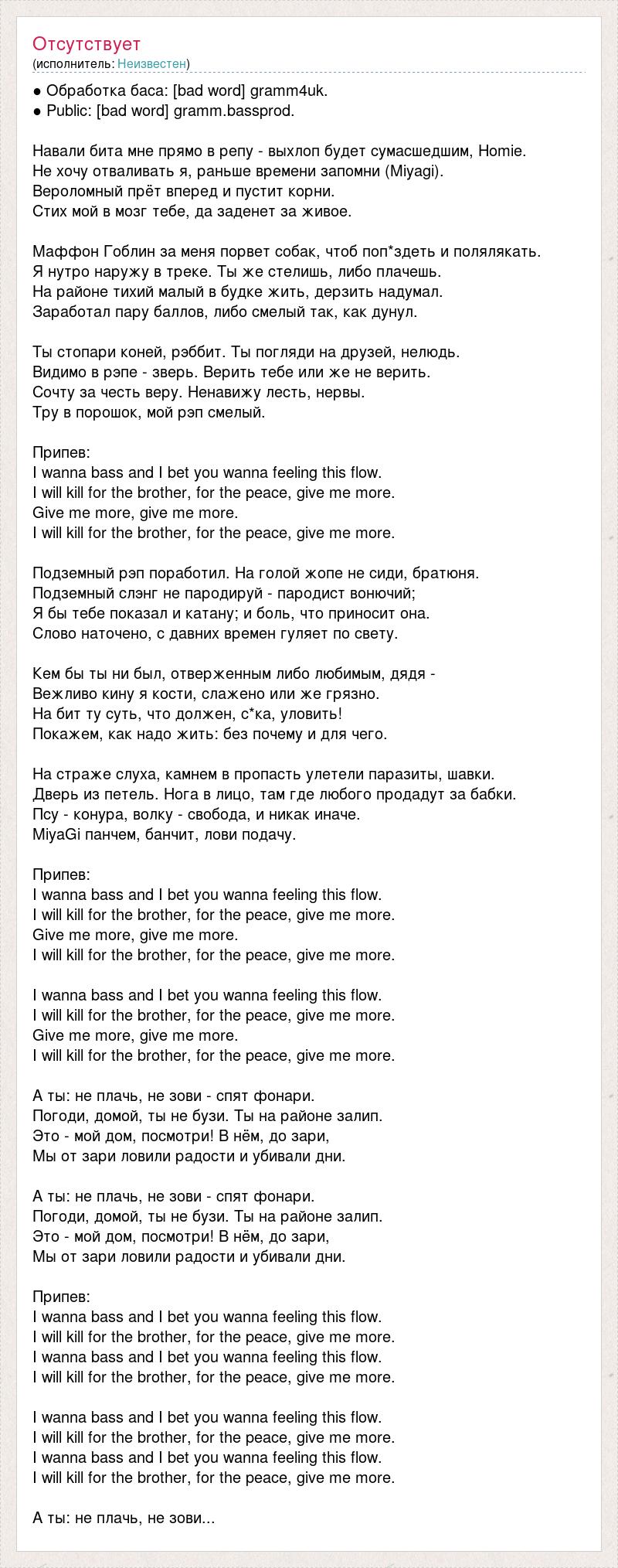 ● Обработка баса: [bad word] gramm4uk. ● Public: [bad word] gramm.bassprod. Навали бита мне прямо в репу - выхлоп будет сумасшедшим, Homie. Не хочу отваливать я, раньше времени запомни (Miyagi). Вероломный прёт вперед и пустит корни. Стих мой в мозг тебе, да заденет за живое. Маффон Гоблин за меня порвет собак, чтоб поп*здеть и полялякать. Я нутро наружу в треке. Ты же стелишь, либо плачешь. На районе тихий малый в будке жить, дерзить надумал. Заработал пару баллов, либо смелый так, как дунул. Ты стопари коней, рэббит. Ты погляди на друзей, нелюдь. Видимо в рэпе - зверь. Верить тебе или же не верить. Сочту за честь веру. Ненавижу лесть, нервы. Тру в порошок, мой рэп смелый. Припев: I wanna bass and I bet you wanna feeling this flow. I will kill for the brother, for the peace, give me more. Give me more, give me more. I will kill for the brother, for the peace, give me more. Подземный рэп поработил. На голой жопе не сиди, братюня. Подземный слэнг не пародируй - пародист вонючий; Я бы тебе показал и катану; и боль, что приносит она. Слово наточено, с давних времен гуляет по свету. Кем бы ты ни был, отверженным либо любимым, дядя - Вежливо кину я кости, слажено или же грязно. На бит ту суть, что должен, с*ка, уловить! Покажем, как надо жить: без почему и для чего. На страже слуха, камнем в пропасть улетели паразиты, шавки. Дверь из петель. Нога в лицо, там где любого продадут за бабки. Псу - конура, волку - свобода, и никак иначе. MiyaGi панчем, банчит, лови подачу. Припев: I wanna bass and I bet you wanna feeling this flow. I will kill for the brother, for the peace, give me more. Give me more, give me more. I will kill for the brother, for the peace, give me more. I wanna bass and I bet you wanna feeling this flow. I will kill for the brother, for the peace, give me more. Give me more, give me more. I will kill for the brother, for the peace, give me more. А ты: не плачь, не зови - спят фонари. Погоди, домой, ты не бузи. Ты на районе залип. Это - мой дом, посмотри! В нём, до зари, Мы от зари ловили радости и убивали дни. А ты: не плачь, не зови - спят фонари. Погоди, домой, ты не бузи. Ты на районе залип. Это - мой дом, посмотри! В нём, до зари, Мы от зари ловили радости и убивали дни. Припев: I wanna bass and I bet you wanna feeling this flow. I will kill for the brother, for the peace, give me more. I wanna bass and I bet you wanna feeling this flow. I will kill for the brother, for the peace, give me more. I wanna bass and I bet you wanna feeling this flow. I will kill for the brother, for the peace, give me more. I wanna bass and I bet you wanna feeling this flow. I will kill for the brother, for the peace, give me more. А ты: не плачь, не зови...
