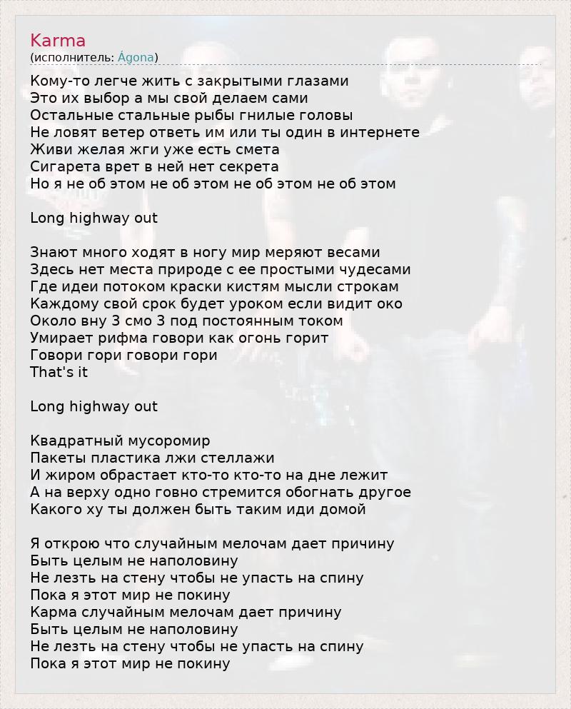 Кому-то легче жить с закрытыми глазами Это их выбор а мы свой делаем сами Остальные стальные рыбы гнилые головы Не ловят ветер ответь им или ты один в интернете Живи желая жги уже есть смета Сигарета врет в ней нет секрета Но я не об этом не об этом не об этом не об этом Long highway out Знают много ходят в ногу мир меряют весами Здесь нет места природе с ее простыми чудесами Где идеи потоком краски кистям мысли строкам Каждому свой срок будет уроком если видит око Около вну 3 смо 3 под постоянным током Умирает рифма говори как огонь горит Говори гори говори гори That's it Long highway out Квадратный мусоромир Пакеты пластика лжи стеллажи И жиром обрастает кто-то кто-то на дне лежит А на верху одно говно стремится обогнать другое Какого ху ты должен быть таким иди домой Я открою что случайным мелочам дает причину Быть целым не наполовину Не лезть на стену чтобы не упасть на спину Пока я этот мир не покину Карма случайным мелочам дает причину Быть целым не наполовину Не лезть на стену чтобы не упасть на спину Пока я этот мир не покину