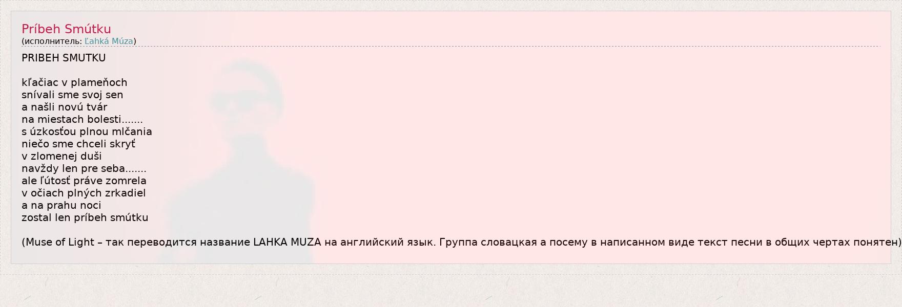 PRIBEH SMUTKU kľačiac v plameňoch snívali sme svoj sen a našli novú tvár na miestach bolesti....... s úzkosťou plnou mlčania niečo sme chceli skryť v zlomenej duši navždy len pre seba....... ale ľútosť práve zomrela v očiach plných zrkadiel a na prahu noci zostal len príbeh smútku (Muse of Light – так переводится название LAHKA MUZA на английский язык. Группа словацкая а посему в написанном виде текст песни в общих чертах понятен)
