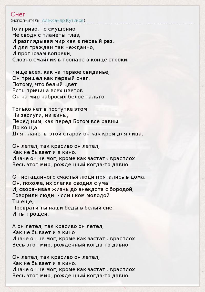 То игриво, то смущенно, Не сводя с планеты глаз, И разглядывая мир как в первый раз. И для граждан так нежданно, И прогнозам вопреки, Словно смайлик в тропаре в конце строки. Чище всех, как на первое свиданье, Он пришел как первый снег, Потому, что белый цвет Есть причина всех цветов. Он на мир набросил белое пальто Только нет в поступке этом Ни заслуги, ни вины, Перед ним, как перед Богом все равны До конца. Для планеты этой старой он как крем для лица. Он летел, так красиво он летел, Как не бывает и в кино. Иначе он не мог, кроме как застать врасплох Весь этот мир, рожденный когда-то давно. От негаданного счастья люди прятались в дома. Он, похоже, их слегка сводил с ума И, сворачивая жизнь до анекдота с бородой, Говорили люди: - слишком молодой Ты еще, Преврати ты наши беды в белый снег И ты прощен. А он летел, так красиво он летел, Как не бывает и в кино. Иначе он не мог, кроме как застать врасплох Весь этот мир, рожденный когда-то давно. Он летел, так красиво он летел, Как не бывает и в кино. Иначе он не мог, кроме как застать врасплох Весь этот мир, рожденный когда-то давно.
