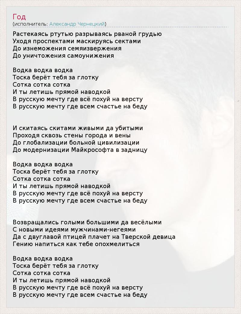 Растекаясь ртутью разрываясь рваной грудью Уходя проспектами маскируясь сектами До изнеможения семяизвержения До уничтожения самоунижения Водка водка водка Тоска берёт тебя за глотку Сотка сотка сотка И ты летишь прямой наводкой В русскую мечту где всё похуй на версту В русскую мечту где всем счастье на беду И скитаясь скитами живыми да убитыми Проходя сквозь стены города и вены До глобализации больной цивилизации До модернизации Майкрософта в задницу Водка водка водка Тоска берёт тебя за глотку Сотка сотка сотка И ты летишь прямой наводкой В русскую мечту где всё похуй на версту В русскую мечту где всем счастье на беду Возвращались голыми большими да весёлыми С новыми идеями мужчинами-негеями Да с двуглавой птицей плачет на Тверской девица Гению напиться как тебе опохмелиться Водка водка водка Тоска берёт тебя за глотку Сотка сотка сотка И ты летишь прямой наводкой В русскую мечту где всё похуй на версту В русскую мечту где всем счастье на беду