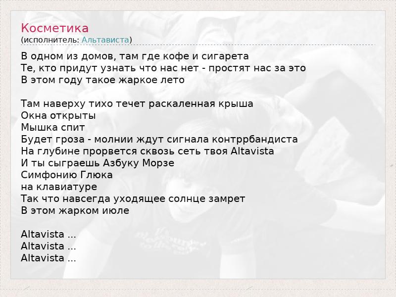 В одном из домов, там где кофе и сигарета Те, кто придут узнать что нас нет - простят нас за это В этом году такое жаркое лето Там наверху тихо течет раскаленная крыша Окна открыты Мышка спит Будет гроза - молнии ждут сигнала контррбандиста На глубине прорвется сквозь сеть твоя Altavista И ты сыграешь Азбуку Морзе Симфонию Глюка на клавиатуре Так что навсегда уходящее солнце замрет В этом жарком июле Altavista ... Altavista ... Altavista ...