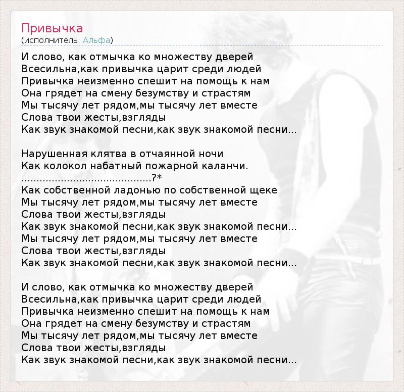 И слово, как отмычка ко множеству дверей Всесильна,как привычка царит среди людей Привычка неизменно спешит на помощь к нам Она грядет на смену безумству и страстям Мы тысячу лет рядом,мы тысячу лет вместе Слова твои жесты,взгляды Как звук знакомой песни,как звук знакомой песни... Нарушенная клятва в отчаянной ночи Как колокол набатный пожарной каланчи. ...........................................?* Как собственной ладонью по собственной щеке Мы тысячу лет рядом,мы тысячу лет вместе Слова твои жесты,взгляды Как звук знакомой песни,как звук знакомой песни... Мы тысячу лет рядом,мы тысячу лет вместе Слова твои жесты,взгляды Как звук знакомой песни,как звук знакомой песни... И слово, как отмычка ко множеству дверей Всесильна,как привычка царит среди людей Привычка неизменно спешит на помощь к нам Она грядет на смену безумству и страстям Мы тысячу лет рядом,мы тысячу лет вместе Слова твои жесты,взгляды Как звук знакомой песни,как звук знакомой песни...