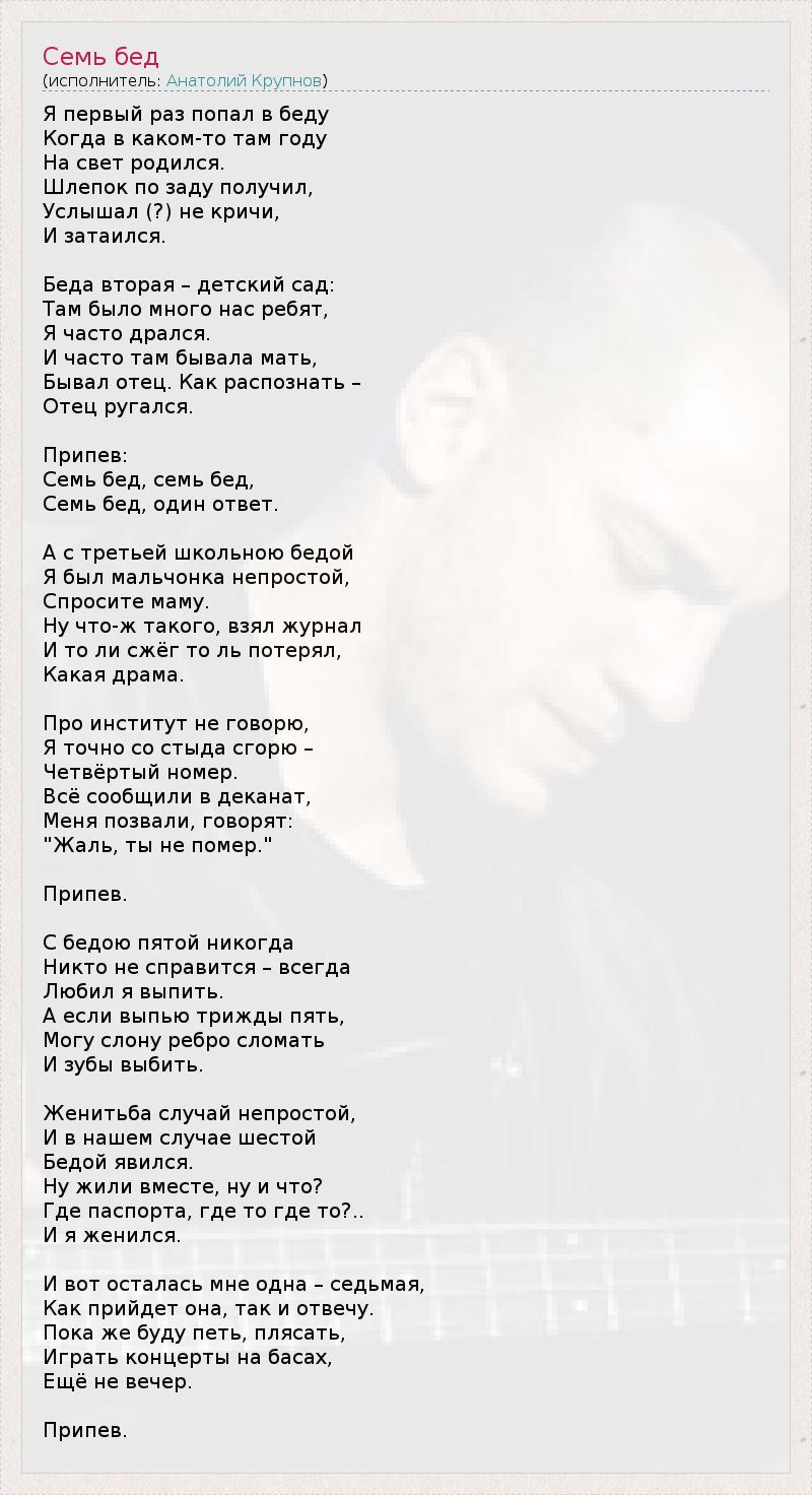 Я первый раз попал в беду Когда в каком-то там году На свет родился. Шлепок по заду получил, Услышал (?) не кричи, И затаился. Беда вторая – детский сад: Там было много нас ребят, Я часто дрался. И часто там бывала мать, Бывал отец. Как распознать – Отец ругался. Припев: Семь бед, семь бед, Семь бед, один ответ. А с третьей школьною бедой Я был мальчонка непростой, Спросите маму. Ну что-ж такого, взял журнал И то ли сжёг то ль потерял, Какая драма. Про институт не говорю, Я точно со стыда сгорю – Четвёртый номер. Всё сообщили в деканат, Меня позвали, говорят: "Жаль, ты не помер." Припев. С бедою пятой никогда Никто не справится – всегда Любил я выпить. А если выпью трижды пять, Могу слону ребро сломать И зубы выбить. Женитьба случай непростой, И в нашем случае шестой Бедой явился. Ну жили вместе, ну и что? Где паспорта, где то где то?.. И я женился. И вот осталась мне одна – седьмая, Как прийдет она, так и отвечу. Пока же буду петь, плясать, Играть концерты на басах, Ещё не вечер. Припев.