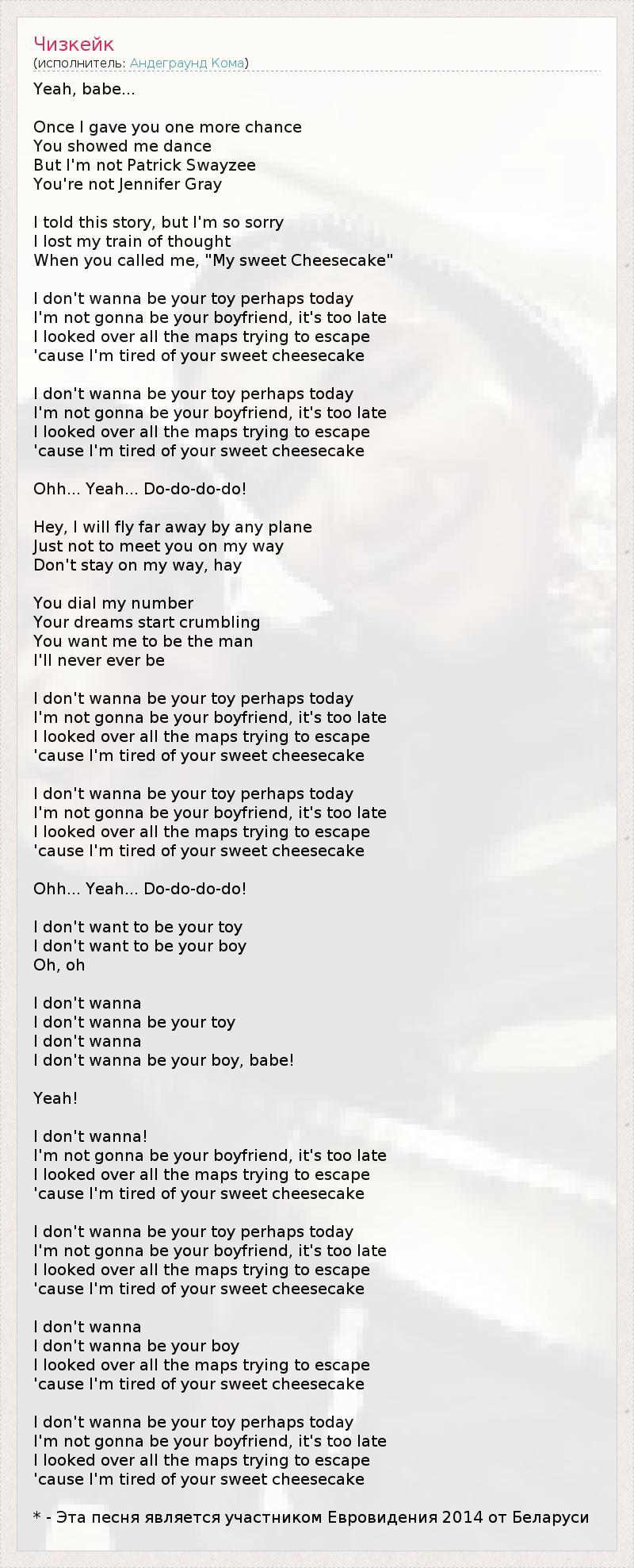 Yeah, babe... Once I gave you one more chance You showed me dance But I'm not Patrick Swayzee You're not Jennifer Gray I told this story, but I'm so sorry I lost my train of thought When you called me, "My sweet Cheesecake" I don't wanna be your toy perhaps today I'm not gonna be your boyfriend, it's too late I looked over all the maps trying to escape 'cause I'm tired of your sweet cheesecake I don't wanna be your toy perhaps today I'm not gonna be your boyfriend, it's too late I looked over all the maps trying to escape 'cause I'm tired of your sweet cheesecake Ohh... Yeah... Do-do-do-do! Hey, I will fly far away by any plane Just not to meet you оn my way Don't stay on my way, hay You dial my number Your dreams start crumbling You want me to be the man I'll never ever be I don't wanna be your toy perhaps today I'm not gonna be your boyfriend, it's too late I looked over all the maps trying to escape 'cause I'm tired of your sweet cheesecake I don't wanna be your toy perhaps today I'm not gonna be your boyfriend, it's too late I looked over all the maps trying to escape 'cause I'm tired of your sweet cheesecake Ohh... Yeah... Do-do-do-do! I don't want to be your toy I don't want to be your boy Oh, oh I don't wanna I don't wanna be your toy I don't wanna I don't wanna be your boy, babe! Yeah! I don't wanna! I'm not gonna be your boyfriend, it's too late I looked over all the maps trying to escape 'cause I'm tired of your sweet cheesecake I don't wanna be your toy perhaps today I'm not gonna be your boyfriend, it's too late I looked over all the maps trying to escape 'cause I'm tired of your sweet cheesecake I don't wanna I don't wanna be your boy I looked over all the maps trying to escape 'cause I'm tired of your sweet cheesecake I don't wanna be your toy perhaps today I'm not gonna be your boyfriend, it's too late I looked over all the maps trying to escape 'cause I'm tired of your sweet cheesecake * - Эта песня является участником Евровидения 2014 от Беларуси