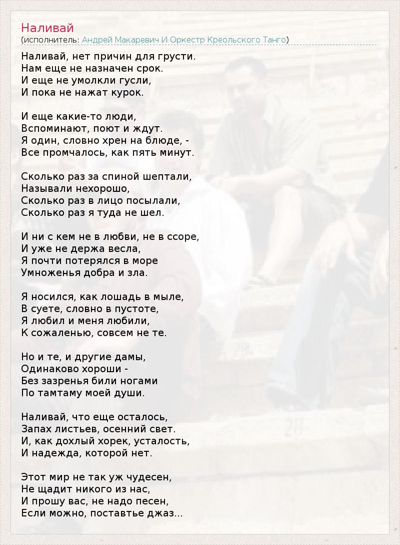 Наливай, нет причин для грусти. Нам еще не назначен срок. И еще не умолкли гусли, И пока не нажат курок. И еще какие-то люди, Вспоминают, поют и ждут. Я один, словно хрен на блюде, - Все промчалось, как пять минут. Сколько раз за спиной шептали, Называли нехорошо, Сколько раз в лицо посылали, Сколько раз я туда не шел. И ни с кем не в любви, не в ссоре, И уже не держа весла, Я почти потерялся в море Умноженья добра и зла. Я носился, как лошадь в мыле, В суете, словно в пустоте, Я любил и меня любили, К сожаленью, совсем не те. Но и те, и другие дамы, Одинаково хороши - Без зазренья били ногами По тамтаму моей души. Наливай, что еще осталось, Запах листьев, осенний свет. И, как дохлый хорек, усталость, И надежда, которой нет. Этот мир не так уж чудесен, Не щадит никого из нас, И прошу вас, не надо песен, Если можно, поставтье джаз...