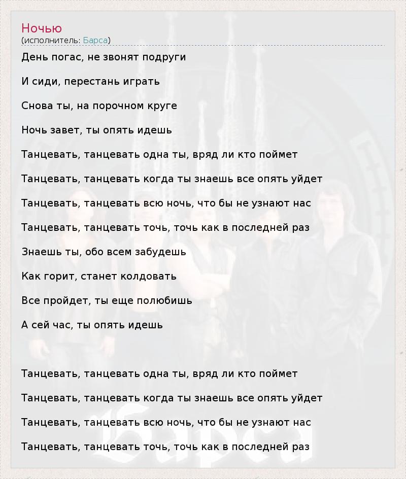 День погас, не звонят подруги И сиди, перестань играть Снова ты, на порочном круге Ночь завет, ты опять идешь Танцевать, танцевать одна ты, вряд ли кто поймет Танцевать, танцевать когда ты знаешь все опять уйдет Танцевать, танцевать всю ночь, что бы не узнают нас Танцевать, танцевать точь, точь как в последней раз Знаешь ты, обо всем забудешь Как горит, станет колдовать Все пройдет, ты еще полюбишь А сей час, ты опять идешь Танцевать, танцевать одна ты, вряд ли кто поймет Танцевать, танцевать когда ты знаешь все опять уйдет Танцевать, танцевать всю ночь, что бы не узнают нас Танцевать, танцевать точь, точь как в последней раз