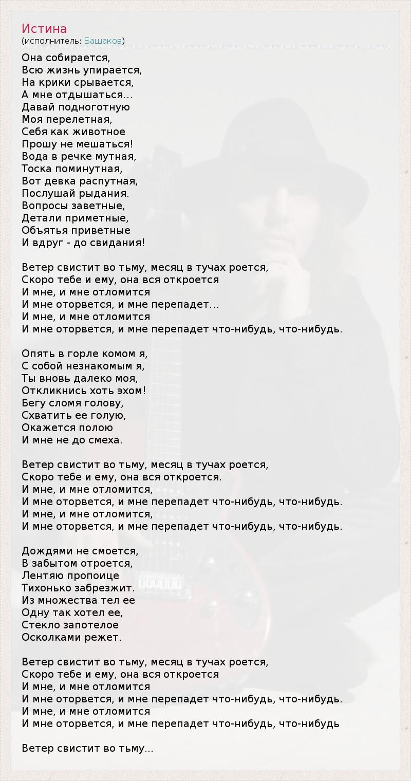 Она собирается, Всю жизнь упирается, На крики срывается, А мне отдышаться… Давай подноготную Моя перелетная, Себя как животное Прошу не мешаться! Вода в речке мутная, Тоска поминутная, Вот девка распутная, Послушай рыдания. Вопросы заветные, Детали приметные, Объятья приветные И вдруг - до свидания! Ветер свистит во тьму, месяц в тучах роется, Скоро тебе и ему, она вся откроется И мне, и мне отломится И мне оторвется, и мне перепадет… И мне, и мне отломится И мне оторвется, и мне перепадет что-нибудь, что-нибудь. Опять в горле комом я, С собой незнакомым я, Ты вновь далеко моя, Откликнись хоть эхом! Бегу сломя голову, Схватить ее голую, Окажется полою И мне не до смеха. Ветер свистит во тьму, месяц в тучах роется, Скоро тебе и ему, она вся откроется. И мне, и мне отломится, И мне оторвется, и мне перепадет что-нибудь, что-нибудь. И мне, и мне отломится, И мне оторвется, и мне перепадет что-нибудь, что-нибудь. Дождями не смоется, В забытом отроется, Лентяю пропоице Тихонько забрезжит. Из множества тел ее Одну так хотел ее, Стекло запотелое Осколками режет. Ветер свистит во тьму, месяц в тучах роется, Скоро тебе и ему, она вся откроется И мне, и мне отломится И мне оторвется, и мне перепадет что-нибудь, что-нибудь. И мне, и мне отломится И мне оторвется, и мне перепадет что-нибудь, что-нибудь Ветер свистит во тьму...