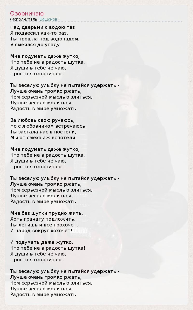 Над дверьми с водою таз Я подвесил как-то раз. Ты прошла под водопадом, Я смеялся до упаду. Мне подумать даже жутко, Что тебе не в радость шутка. Я души в тебе не чаю, Просто я озорничаю. Ты веселую улыбку не пытайся удержать - Лучше очень громко ржать, Чем серьезной мыслью злиться. Лучше весело молиться - Радость в мире умножать! За любовь свою ручаюсь, Но с любовником встречаюсь. Ты застала нас в постели, Мы от смеха аж вспотели. Мне подумать даже жутко, Что тебе не в радость шутка. Я души в тебе не чаю, Просто я озорничаю. Ты веселую улыбку не пытайся удержать - Лучше очень громко ржать, Чем серьезной мыслью злиться. Лучше весело молиться - Радость в мире умножать! Мне без шутки трудно жить, Хоть гранату подложить. Ты летишь и все грохочет, И народ вокруг хохочет! И подумать даже жутко, Что тебе не в радость шутка! Я души в тебе не чаю, Просто я озорничаю. Ты веселую улыбку не пытайся удержать - Лучше очень громко ржать, Чем серьезной мыслью злиться. Лучше весело молиться - Радость в мире умножать!