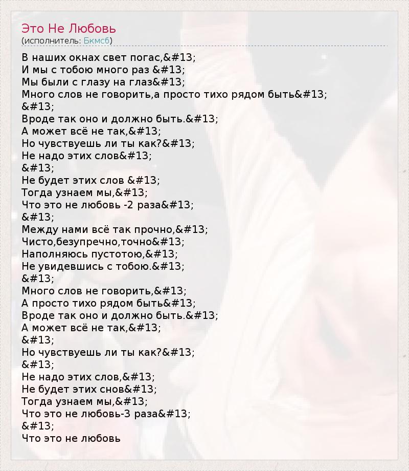 В наших окнах свет погас, И мы с тобою много раз Мы были с глазу на глаз Много слов не говорить,а просто тихо рядом быть Вроде так оно и должно быть. А может всё не так, Но чувствуешь ли ты как? Не надо этих слов Не будет этих слов Тогда узнаем мы, Что это не любовь -2 раза Между нами всё так прочно, Чисто,безупречно,точно Наполняюсь пустотою, Не увидевшись с тобою. Много слов не говорить, А просто тихо рядом быть Вроде так оно и должно быть. А может всё не так, Но чувствуешь ли ты как? Не надо этих слов, Не будет этих снов Тогда узнаем мы, Что это не любовь-3 раза Что это не любовь