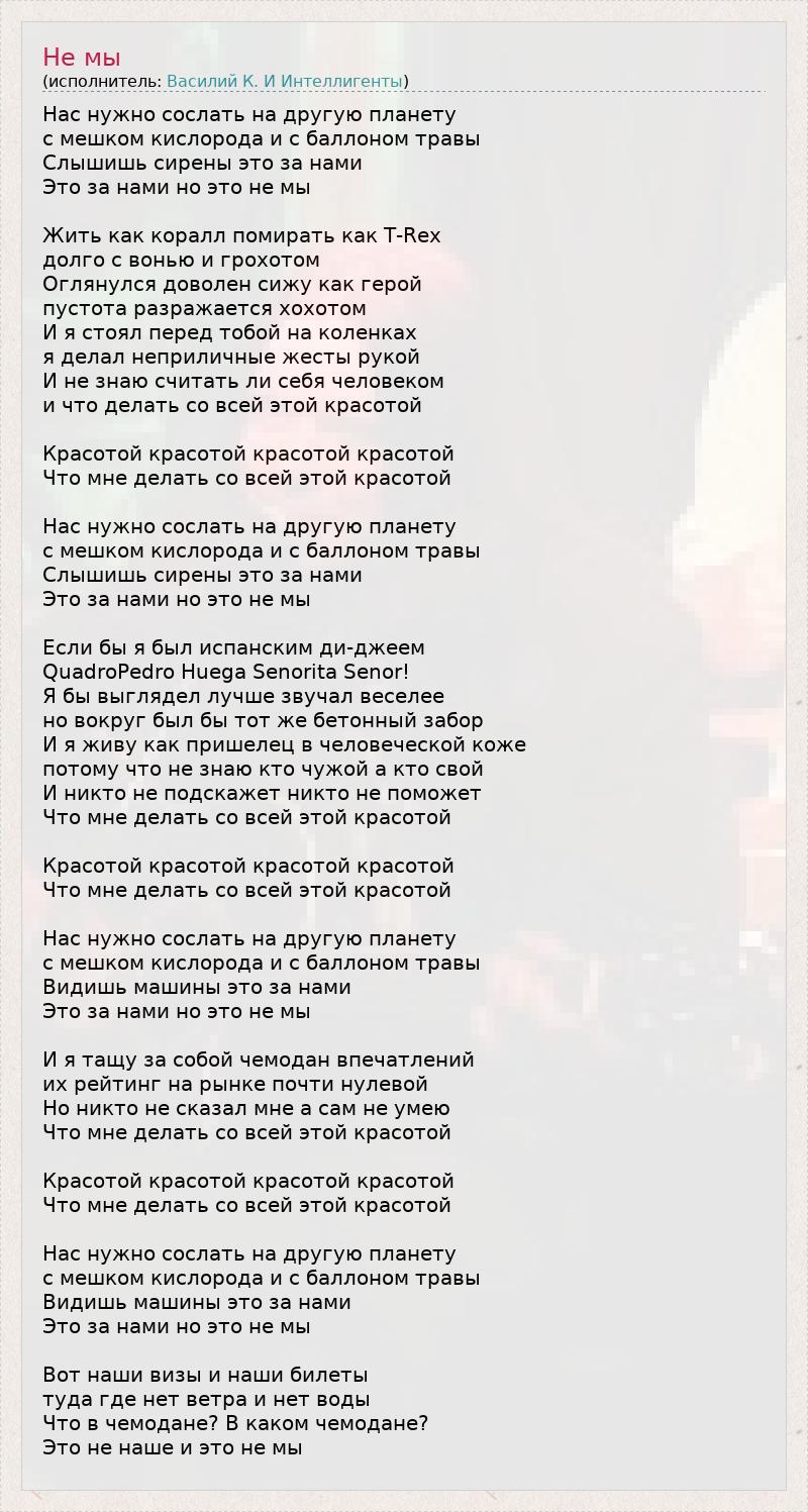 Нас нужно сослать на другую планету с мешком кислорода и с баллоном травы Слышишь сирены это за нами Это за нами но это не мы Жить как коралл помирать как T-Rex долго с вонью и грохотом Оглянулся доволен сижу как герой пустота разражается хохотом И я стоял перед тобой на коленках я делал неприличные жесты рукой И не знаю считать ли себя человеком и что делать со всей этой красотой Красотой красотой красотой красотой Что мне делать со всей этой красотой Нас нужно сослать на другую планету с мешком кислорода и с баллоном травы Слышишь сирены это за нами Это за нами но это не мы Если бы я был испанским ди-джеем QuadroPedro Huega Senorita Senor! Я бы выглядел лучше звучал веселее но вокруг был бы тот же бетонный забор И я живу как пришелец в человеческой коже потому что не знаю кто чужой а кто свой И никто не подскажет никто не поможет Что мне делать со всей этой красотой Красотой красотой красотой красотой Что мне делать со всей этой красотой Нас нужно сослать на другую планету с мешком кислорода и с баллоном травы Видишь машины это за нами Это за нами но это не мы И я тащу за собой чемодан впечатлений их рейтинг на рынке почти нулевой Но никто не сказал мне а сам не умею Что мне делать со всей этой красотой Красотой красотой красотой красотой Что мне делать со всей этой красотой Нас нужно сослать на другую планету с мешком кислорода и с баллоном травы Видишь машины это за нами Это за нами но это не мы Вот наши визы и наши билеты туда где нет ветра и нет воды Что в чемодане? В каком чемодане? Это не наше и это не мы