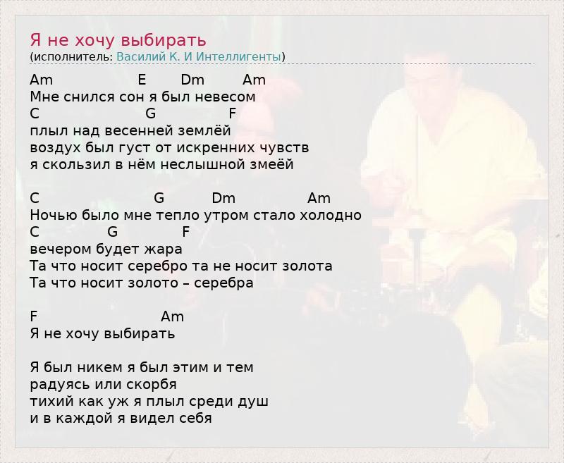Am E Dm Am Мне снился сон я был невесом C G F плыл над весенней землёй воздух был густ от искренних чувств я скользил в нём неслышной змеёй C G Dm Am Ночью было мне тепло утром стало холодно C G F вечером будет жара Та что носит серебро та не носит золота Та что носит золото – серебра F Am Я не хочу выбирать Я был никем я был этим и тем радуясь или скорбя тихий как уж я плыл среди душ и в каждой я видел себя