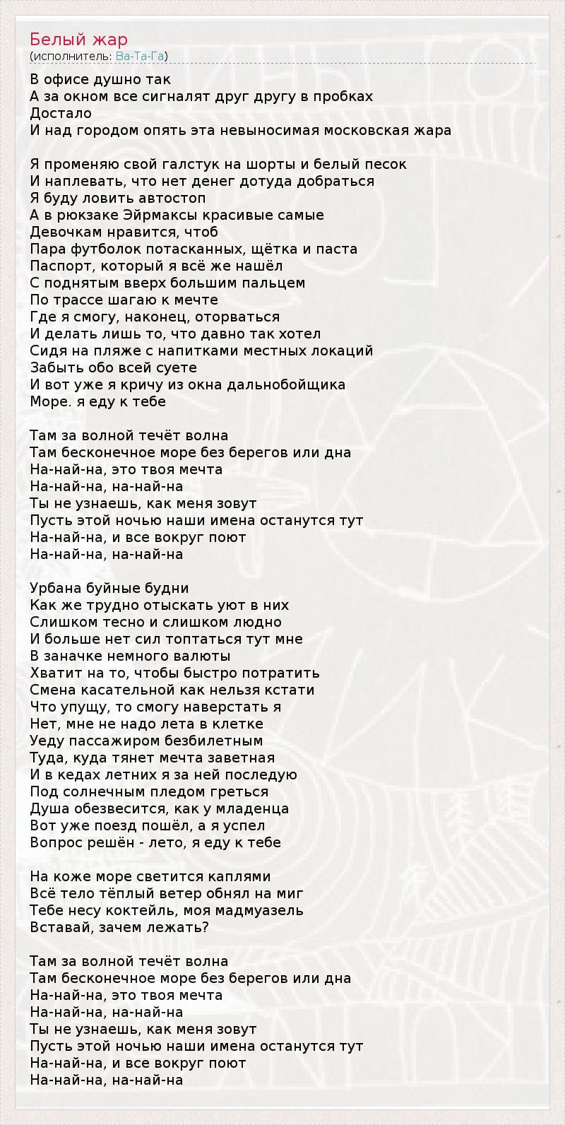 В офисе душно так А за окном все сигналят друг другу в пробках Достало И над городом опять эта невыносимая московская жара Я променяю свой галстук на шорты и белый песок И наплевать, что нет денег дотуда добраться Я буду ловить автостоп А в рюкзаке Эйрмаксы красивые самые Девочкам нравится, чтоб Пара футболок потасканных, щётка и паста Паспорт, который я всё же нашёл С поднятым вверх большим пальцем По трассе шагаю к мечте Где я смогу, наконец, оторваться И делать лишь то, что давно так хотел Сидя на пляже с напитками местных локаций Забыть обо всей суете И вот уже я кричу из окна дальнобойщика Море. я еду к тебе Там за волной течёт волна Там бесконечное море без берегов или дна На-най-на, это твоя мечта На-най-на, на-най-на Ты не узнаешь, как меня зовут Пусть этой ночью наши имена останутся тут На-най-на, и все вокруг поют На-най-на, на-най-на Урбана буйные будни Как же трудно отыскать уют в них Слишком тесно и слишком людно И больше нет сил топтаться тут мне В заначке немного валюты Хватит на то, чтобы быстро потратить Смена касательной как нельзя кстати Что упущу, то смогу наверстать я Нет, мне не надо лета в клетке Уеду пассажиром безбилетным Туда, куда тянет мечта заветная И в кедах летних я за ней последую Под солнечным пледом греться Душа обезвесится, как у младенца Вот уже поезд пошёл, а я успел Вопрос решён - лето, я еду к тебе На коже море светится каплями Всё тело тёплый ветер обнял на миг Тебе несу коктейль, моя мадмуазель Вставай, зачем лежать? Там за волной течёт волна Там бесконечное море без берегов или дна На-най-на, это твоя мечта На-най-на, на-най-на Ты не узнаешь, как меня зовут Пусть этой ночью наши имена останутся тут На-най-на, и все вокруг поют На-най-на, на-най-на